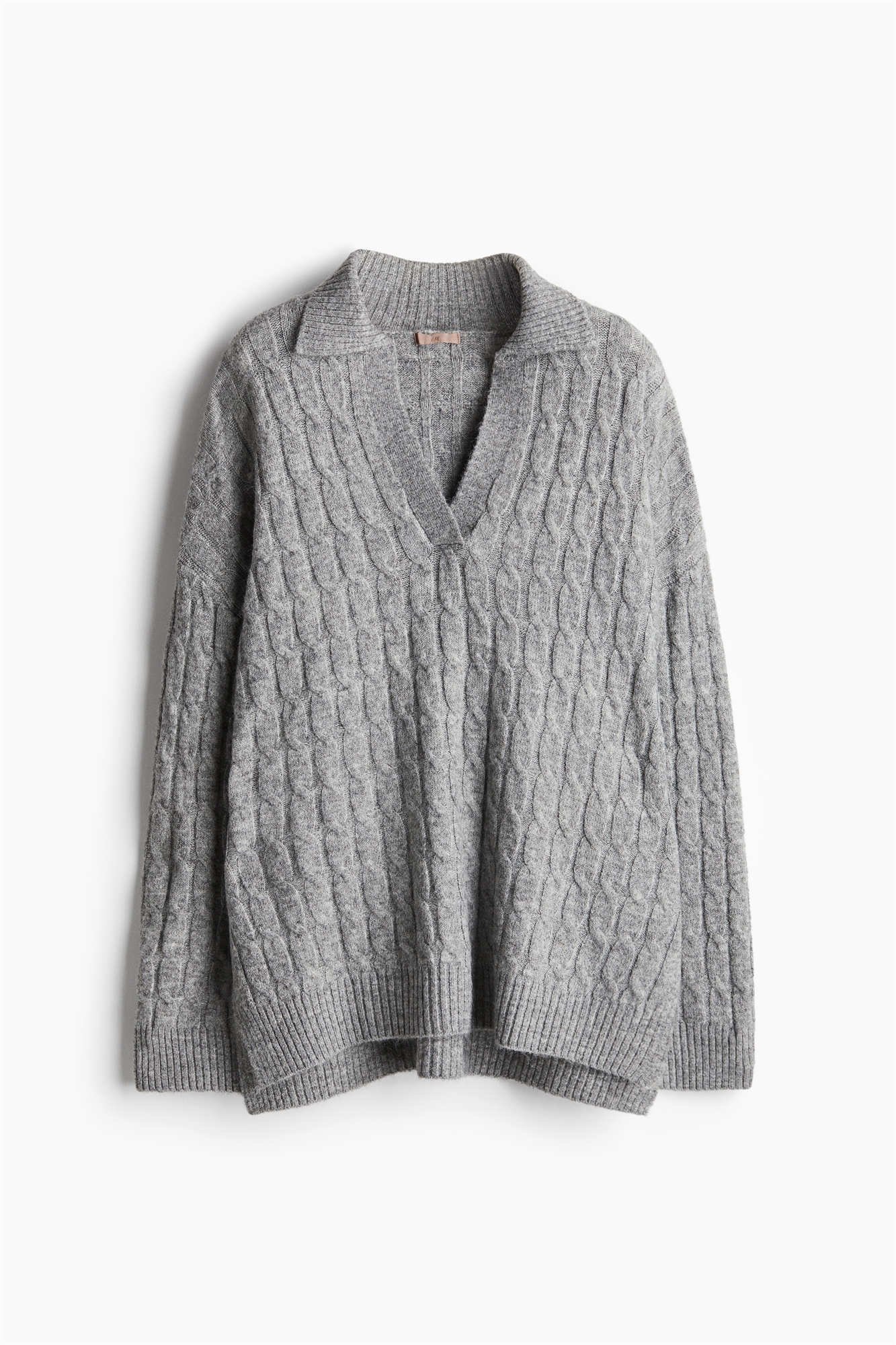 Джемпер из мягкого кабельного трикотажа. Свободный крой с V-образным вырезом, низко опущенными плечами, длинными рукавами и окантовкой по вырезу, манжетам и подолу. Слегка наклоненный разрез с каждой стороны подола.