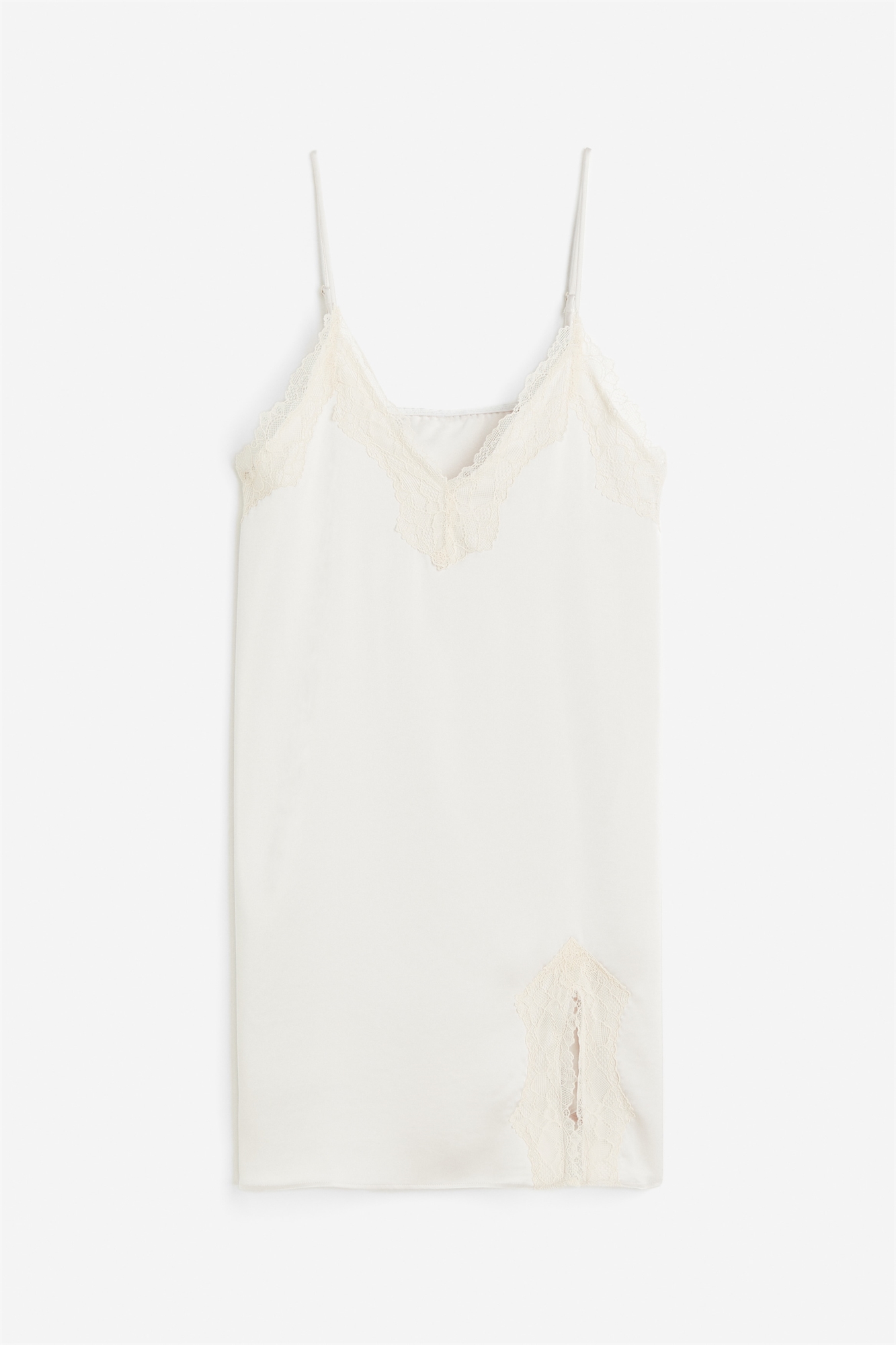 Короткая атласная ночная сорочка с V-образным вырезом, регулируемыми бретелями-спагетти и разрезом спереди. Кружевная отделка в виде гребешков вокруг выреза и разреза.