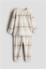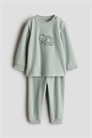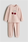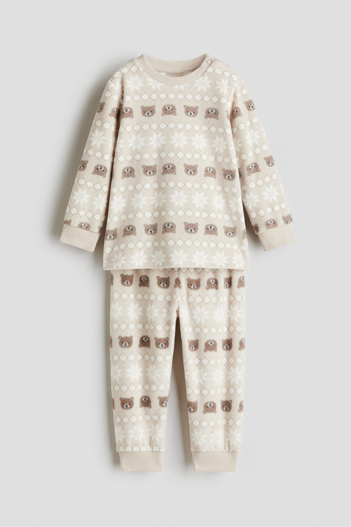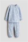 Пижама из мягкого, уютного флиса. Верхняя часть с длинными рукавами, застежками на одном плече (кроме размеров 2-4Y) и тесемками по вырезу горловины и манжетам. Низ с эластичной талией и ребристыми краями.