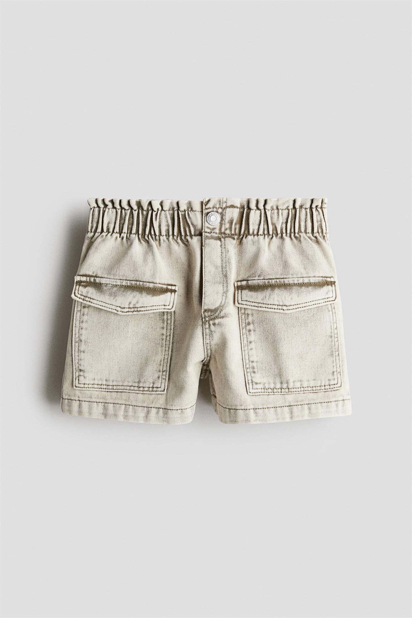 Шорты свободного кроя из моющегося хлопкового денима. Эластичная талия в виде бумажного пакета, фальшивая ширинка с кнопкой, диагональные передние карманы и открытые задние карманы.