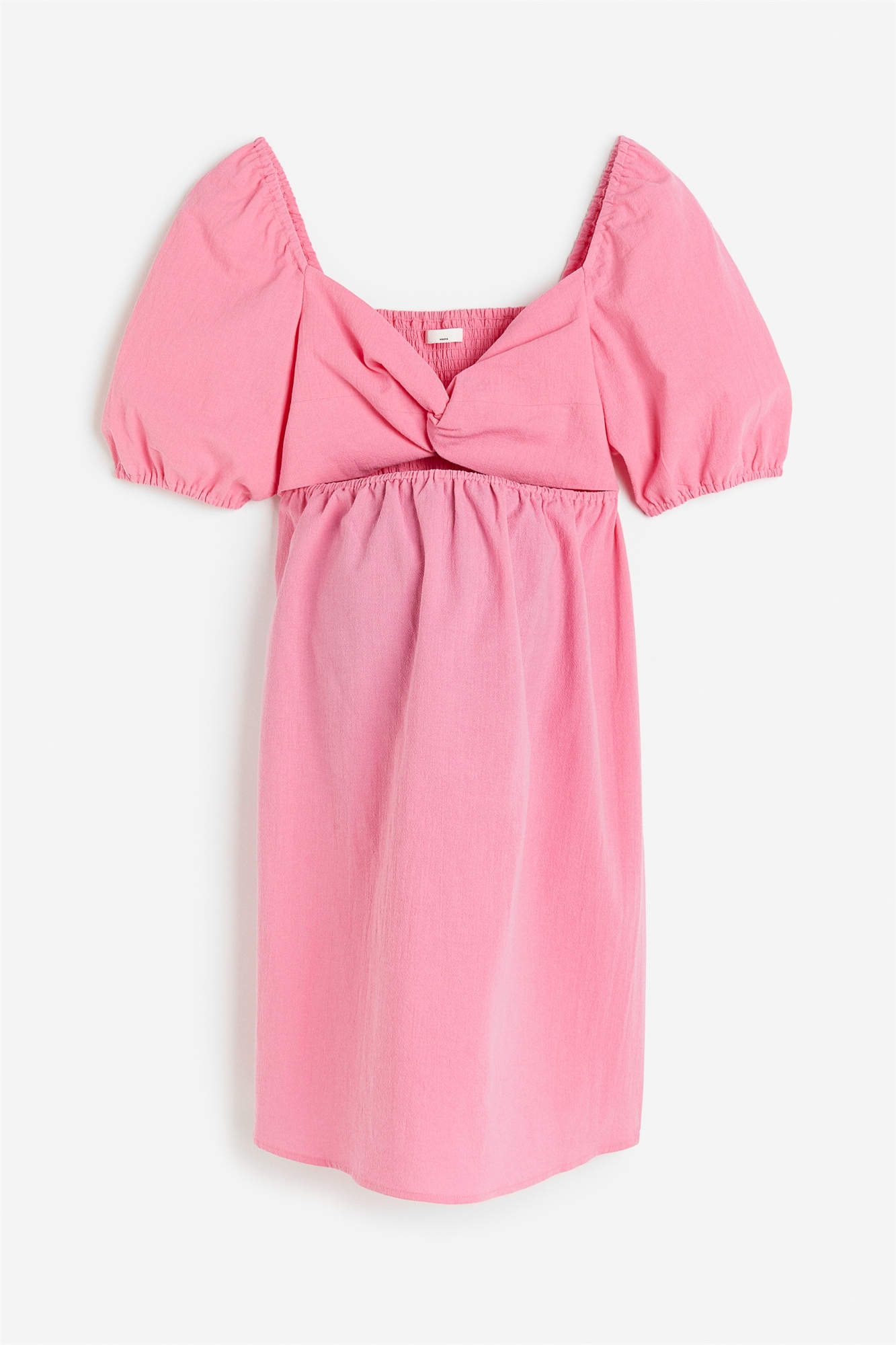 Короткое приталенное платье из хлопковой ткани. С вырезом в форме сердца, закрученными деталями и вырезом спереди. Сзади вставка в виде носка. Короткие пышные рукава с узкими эластичными манжетами на плечах. Без подкладки.