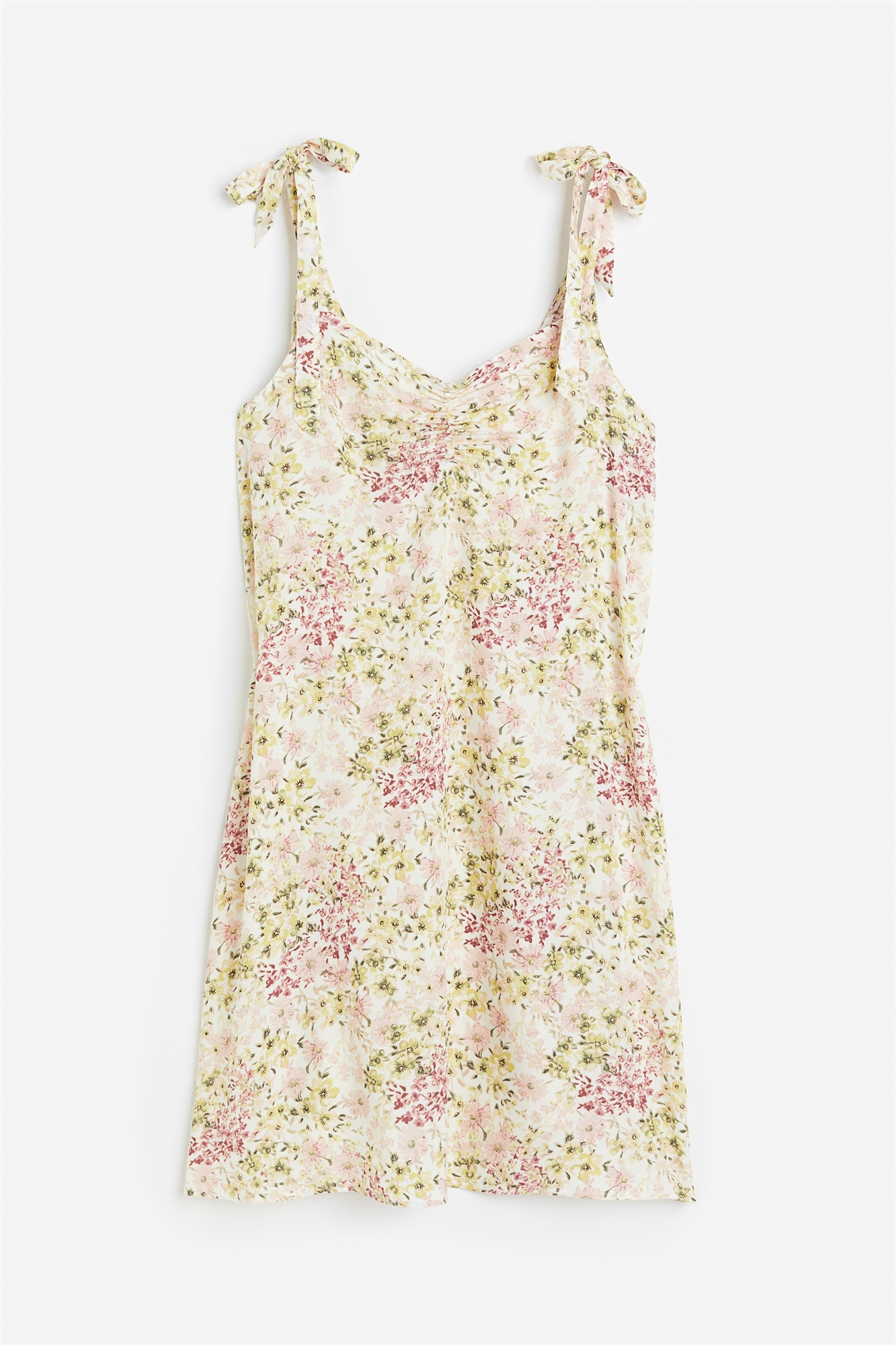 Платье А-линии длиной до колена из вискозного крепа. Завязки на плечах и вырез в форме сердца со сборкой по центру бюста. Глубокий V-образный вырез сзади. Аккуратная расклешенная юбка. Без подкладки.