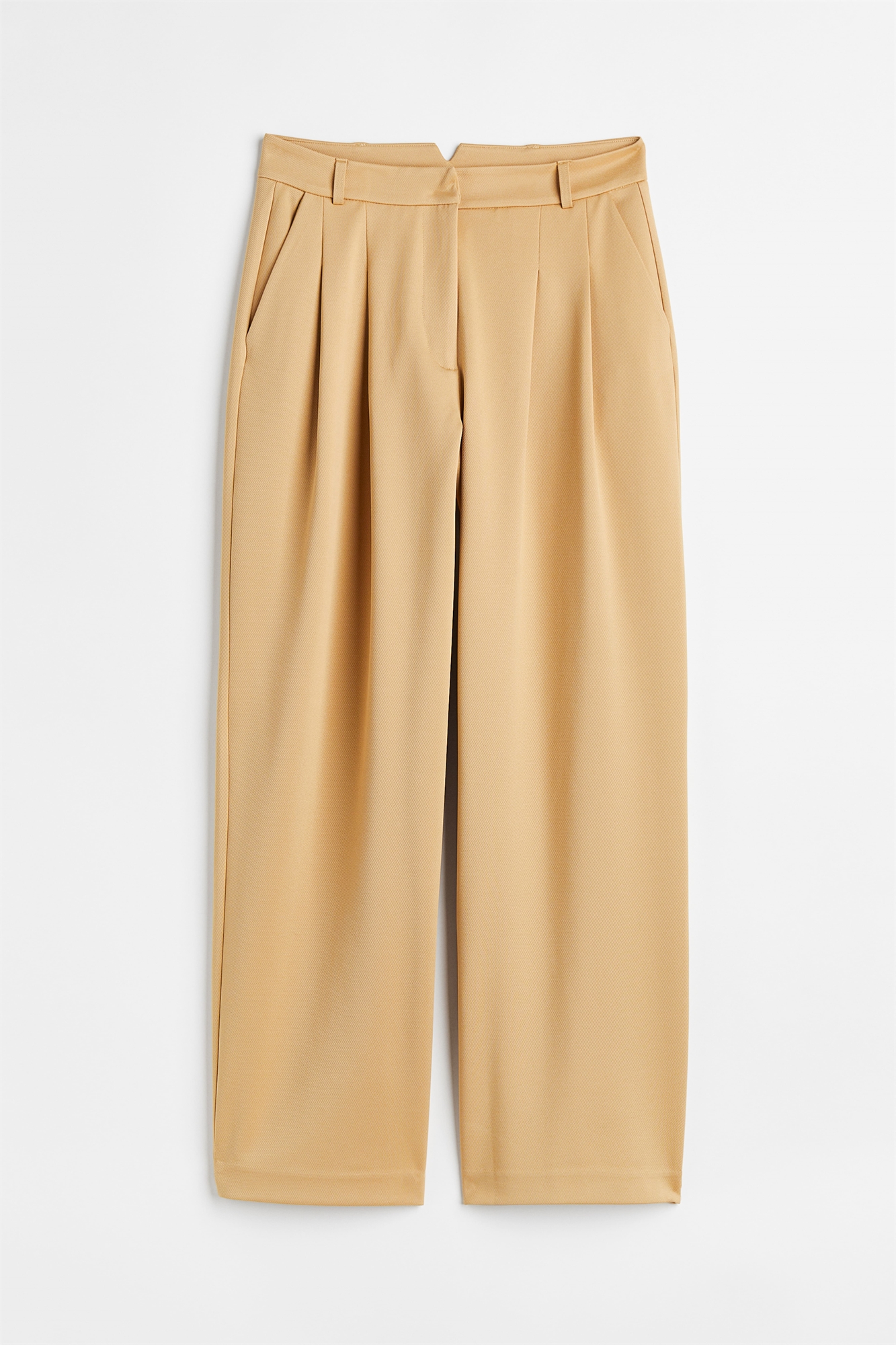 Классические, элегантные брюки со складками из плотного джерси, изготовленного из смеси вискозы. Регулярный пояс с застежкой на молнию и потайные крючки. Косые боковые карманы и втачные карманы сзади. Прямые, широкие штанины.