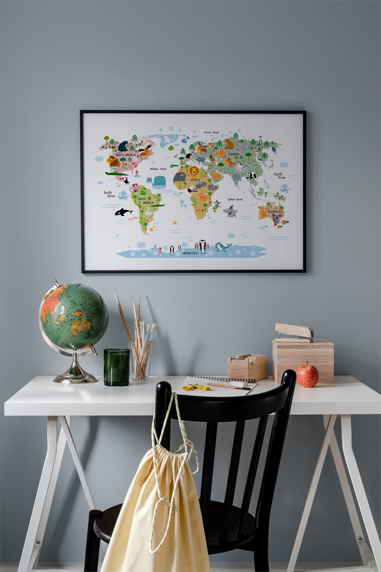 Пусть ваш ребенок исследует все уголки мира с помощью нашей красочной и подробной карты мира, которая идеально дополнит детскую комнату. На картине изображены дикие млекопитающие, рептилии, птицы и рыбы, обитающие на разных континентах. Гарантированно веселый способ обучения для детей! Любимая картина Postery!