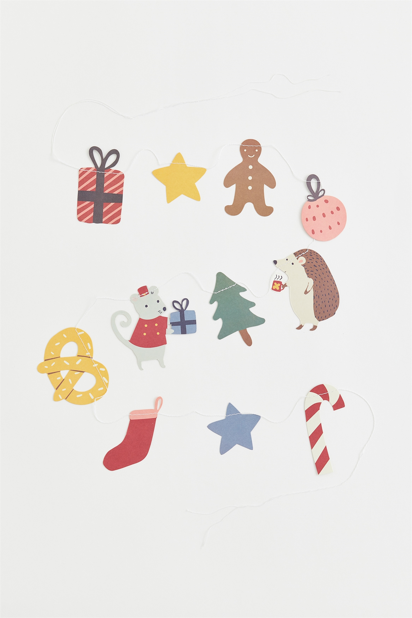 Бант из картона с праздничными мотивами: пряничный человечек, елочная игрушка и звезда. Длина 182 см.