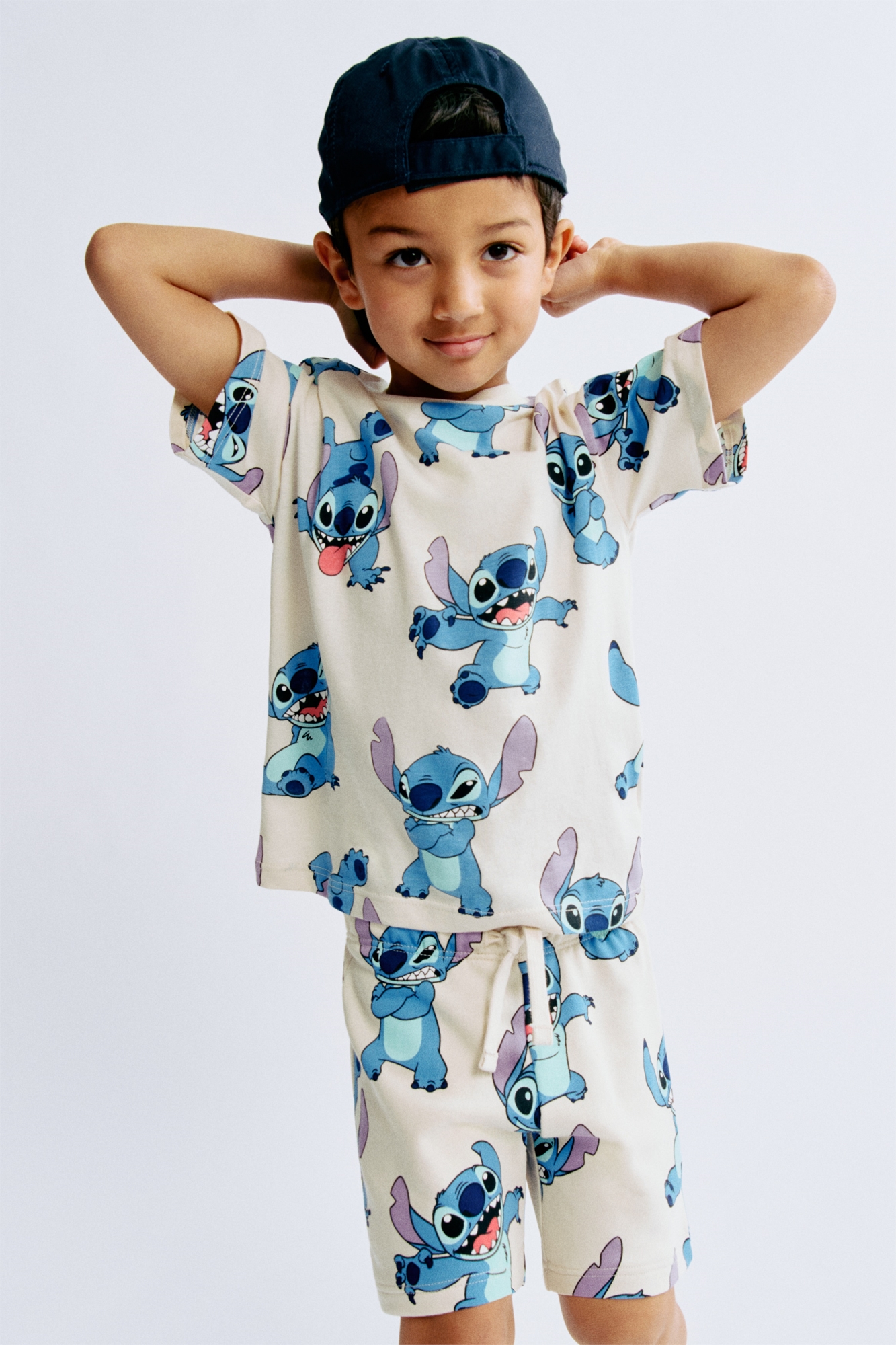 Комплект из футболки и шорт из мягкой ткани с принтом. Футболка из хлопкового джерси со спущенными плечами, широкими рукавами и тесемками по вырезу горловины. Шорты из легкой толстовочной ткани с эластичной отделкой и утягивающим шнурком на талии.