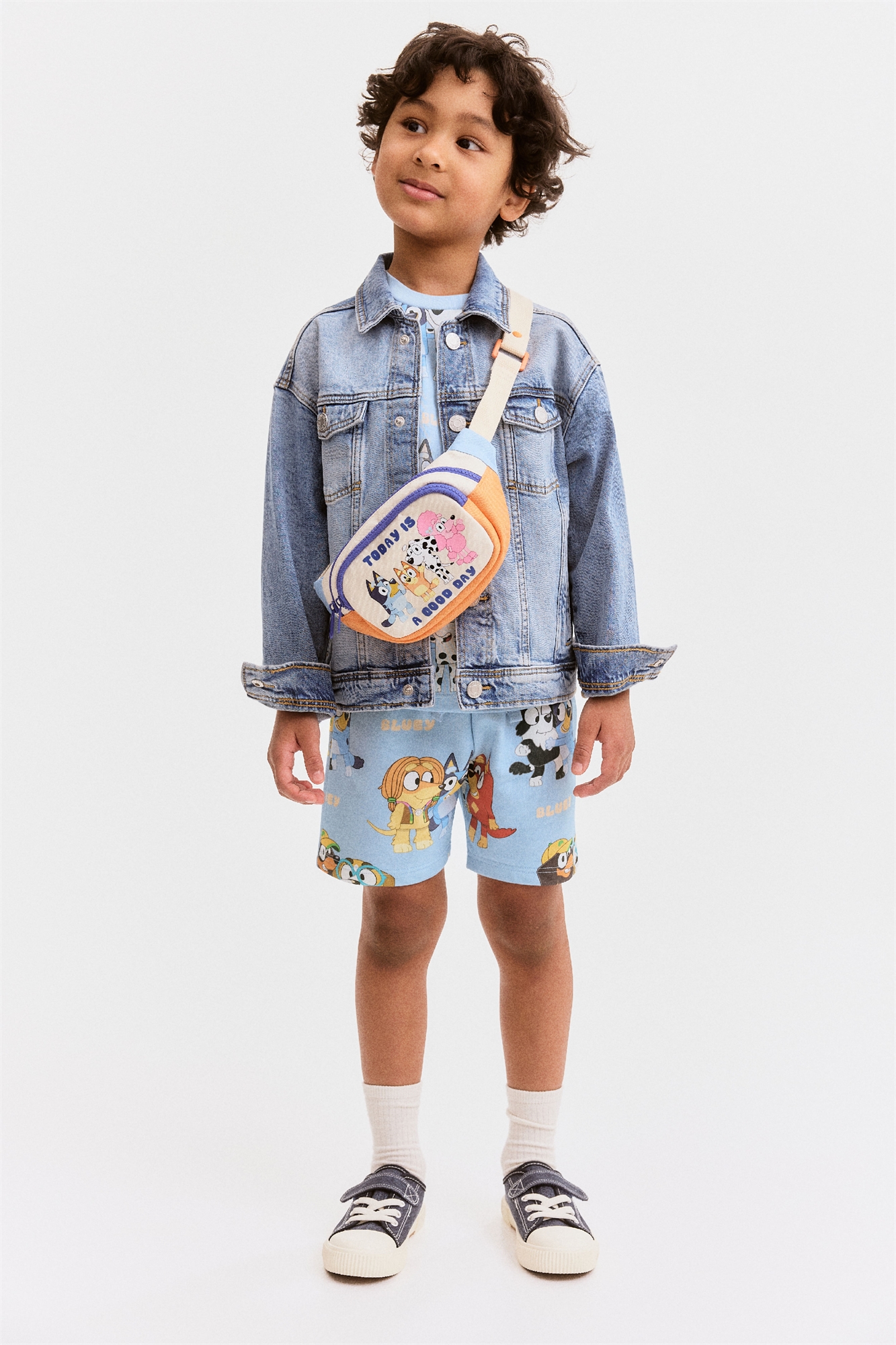 Комплект из футболки и шорт из мягкой ткани с принтом. Футболка из хлопкового джерси со спущенными плечами, широкими рукавами и тесемками по вырезу горловины. Шорты из легкой толстовочной ткани с эластичной отделкой и утягивающим шнурком на талии.