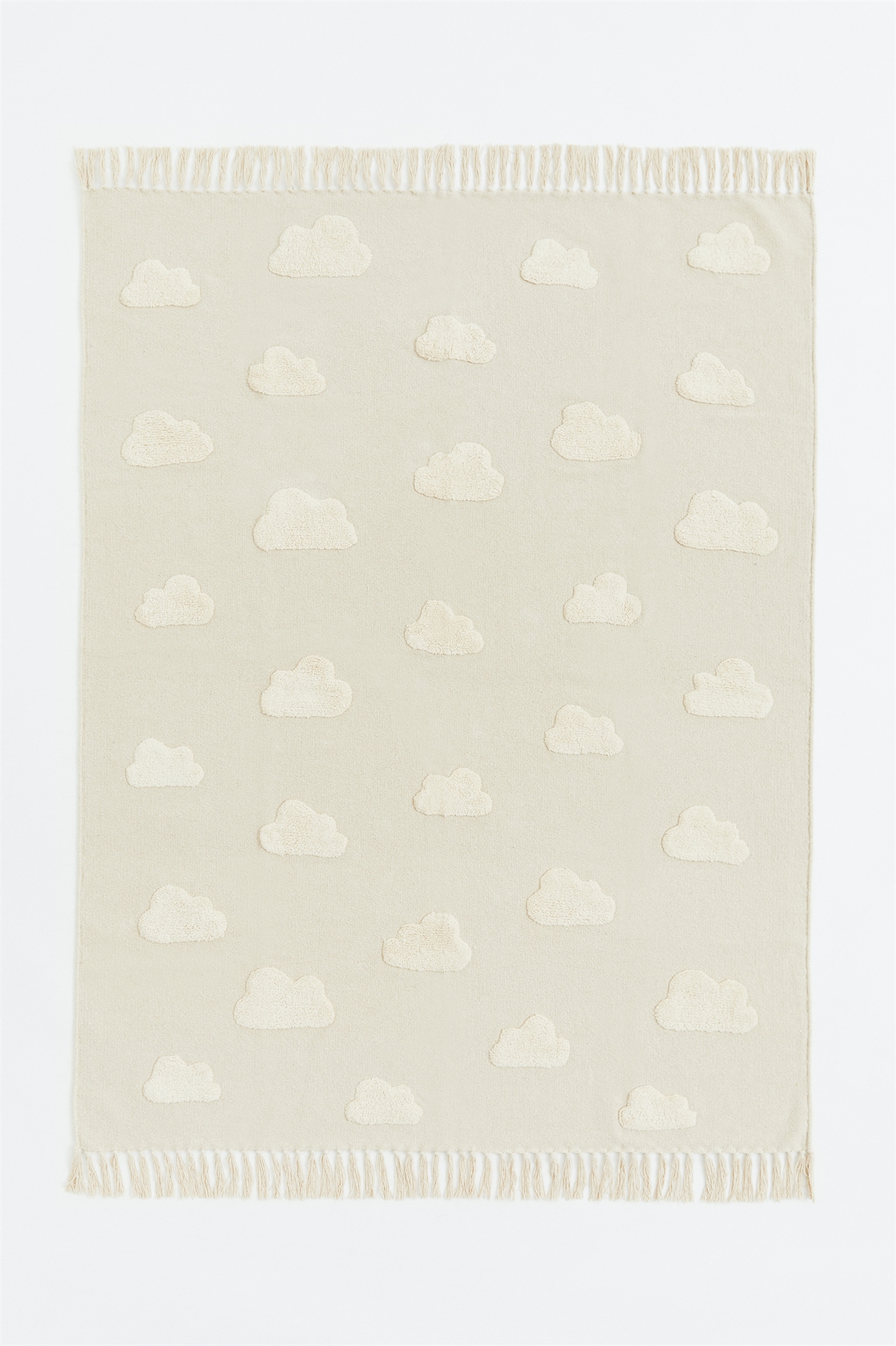 Коврик из прочной хлопчатобумажной ткани с вывязанным узором в виде облаков того же цвета и бахромой по коротким сторонам. Нескользящая нижняя сторона.