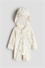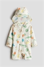 Солнцезащитный костюм и соответствующая солнцезащитная шапочка из узорчатого материала с УФ-защитой. Цельный костюм с небольшим воротником-стойкой, длинными рукавами реглан, короткими ногами и застежкой-молнией спереди с защитой подбородка от натирания. Шапочка с козырьком спереди и отворотом сзади для защиты задней части шеи. UPF 50.