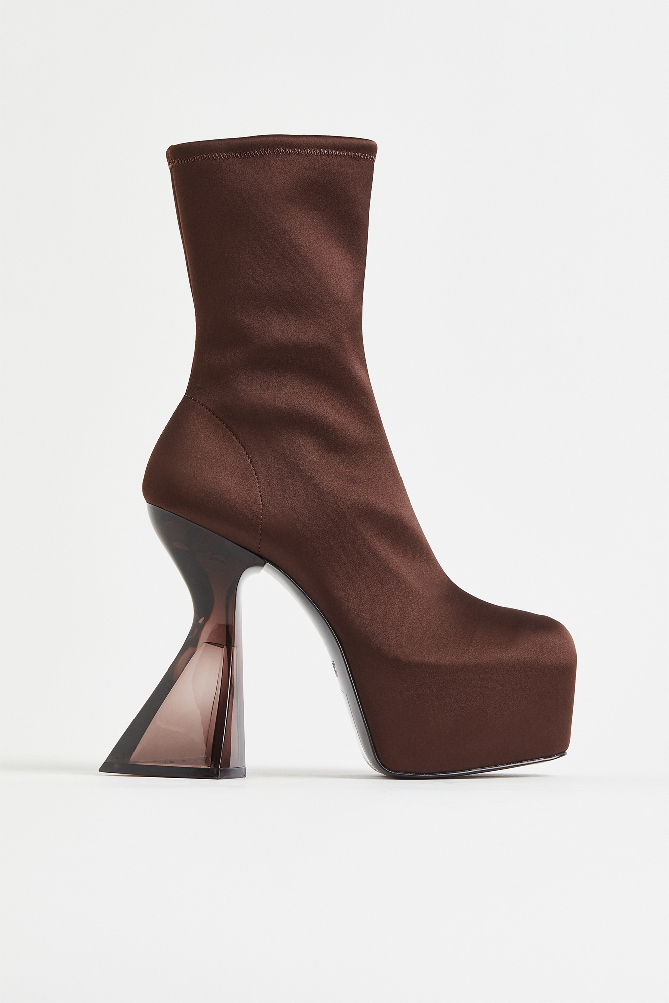 История метаверсального дизайна. Сапоги из эластичного атласа с голенищем длиной до теленка, подошвой на массивной платформе и скульптурным каблуком. Атласные подкладка и стелька. Рифленая резиновая подошва. Платформа 6 см. Каблук 14,2 см.