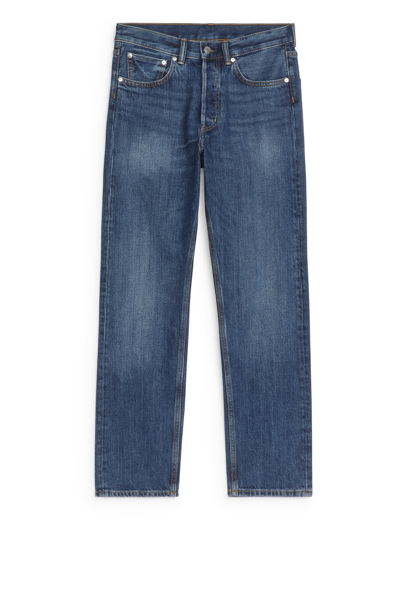 Классические джинсы с пятью карманами и непринужденной посадкой в области сиденья и бедер. Изготовлены из неэластичной джинсовой ткани. Слегка опущенная промежность, сужающиеся к низу ноги от колена и ширинка на пуговицах.