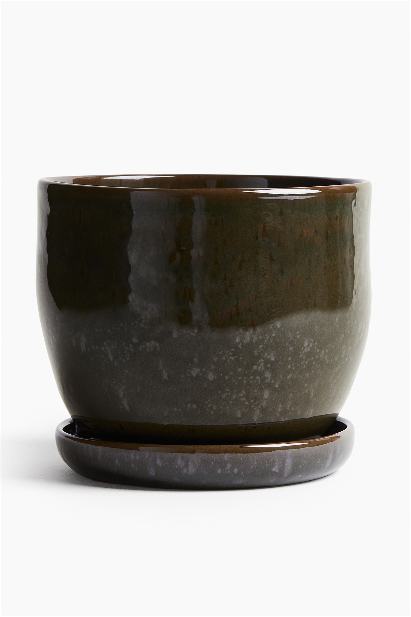 Терракотовый горшок для растений с дренажным отверстием на дне и соответствующее блюдце. Диаметр блюдца 19,5 см. Высота горшка 18 см. Диаметр в верхней части 22 см.