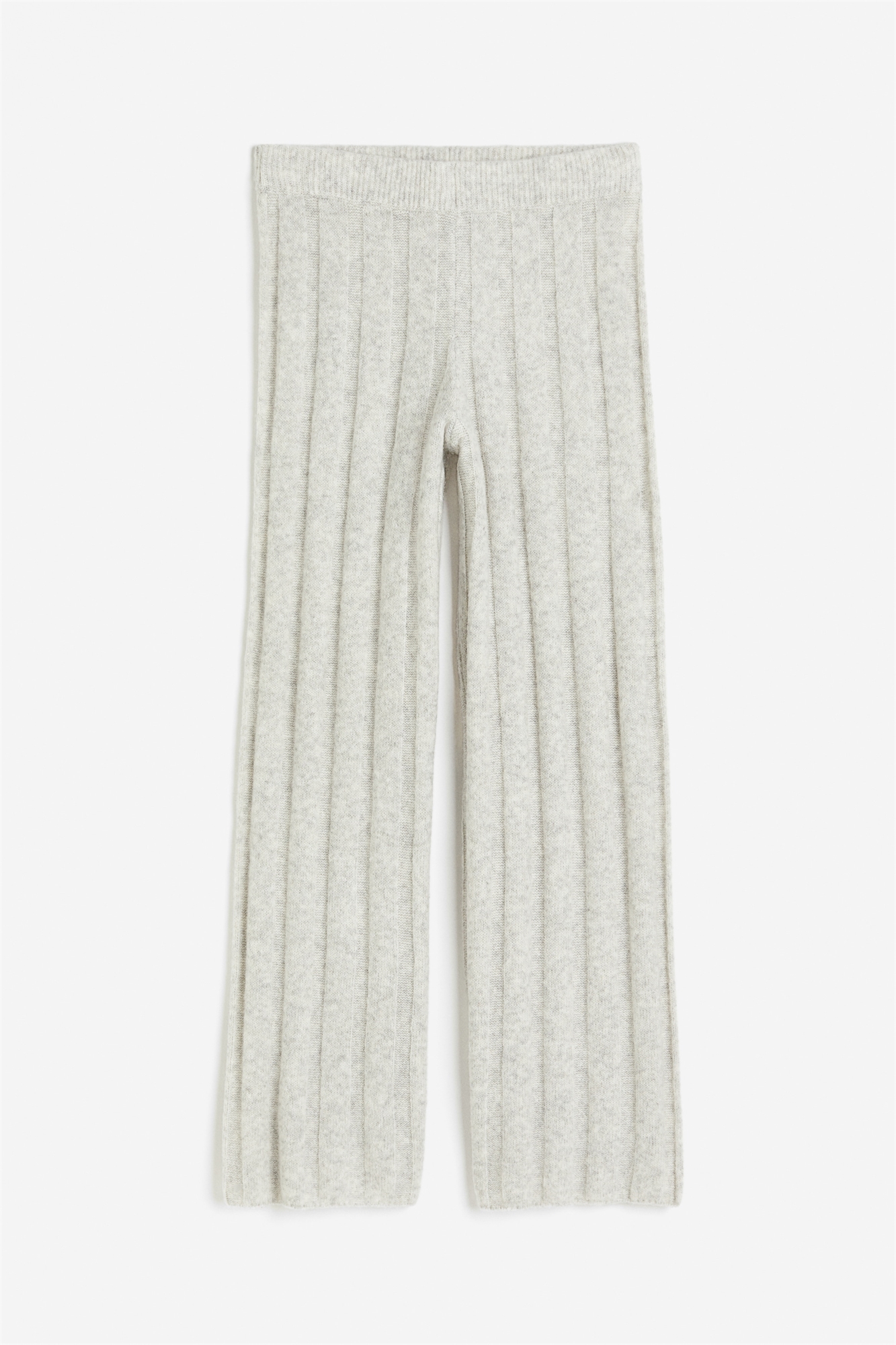 Брюки свободного кроя из мягкого трикотажа в рубчик, выполненного из шерстяной смеси. Регулярная талия со скрытой резинкой и широкие, удлиненные ноги.