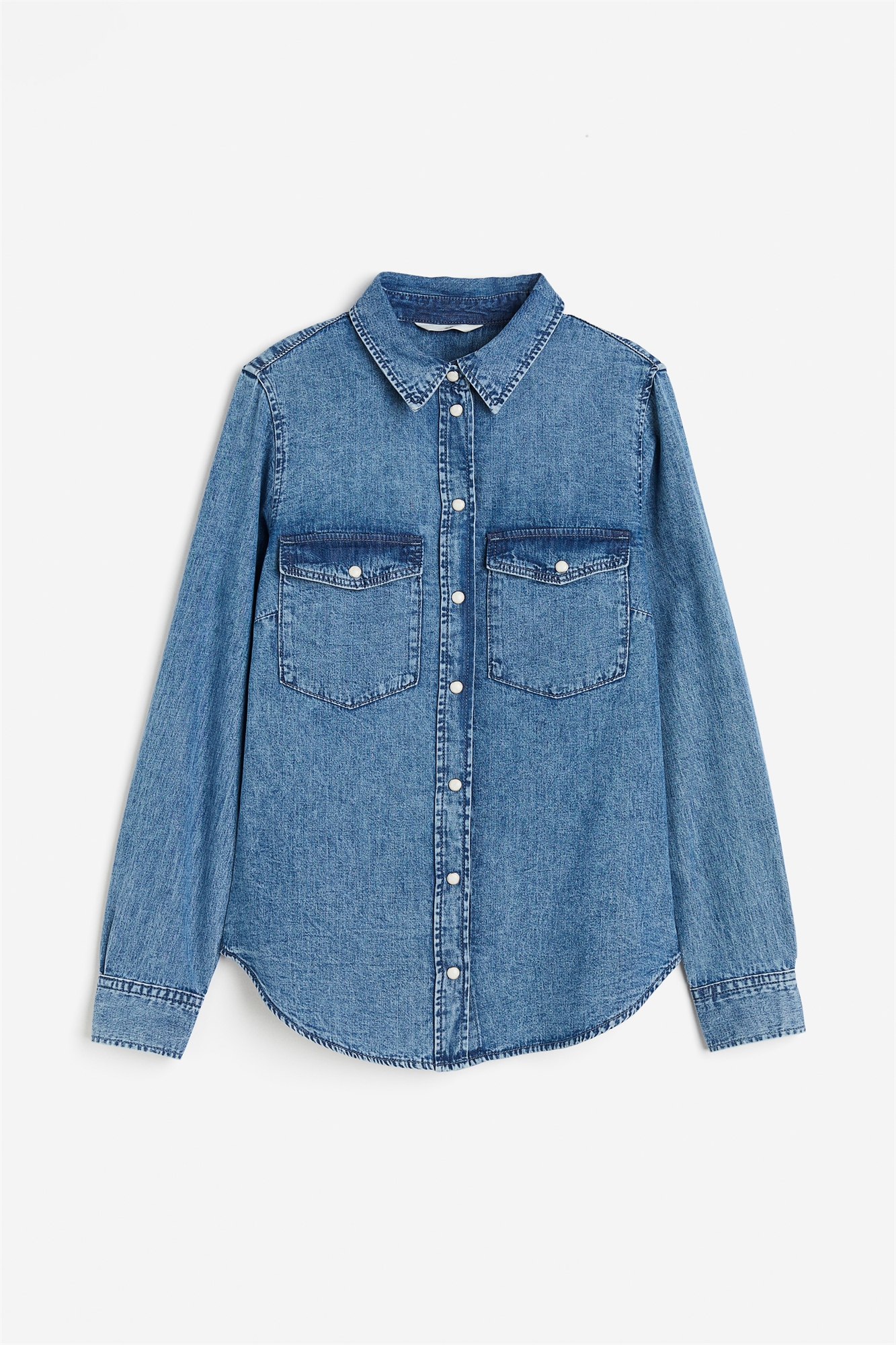 Облегающая рубашка из прочного хлопкового денима с воротником и застежками на кнопках спереди. V-образный выступ и формирующие вытачки сзади, длинные рукава с притачными манжетами и накладные нагрудные карманы с притачной планкой. Закругленный подол.