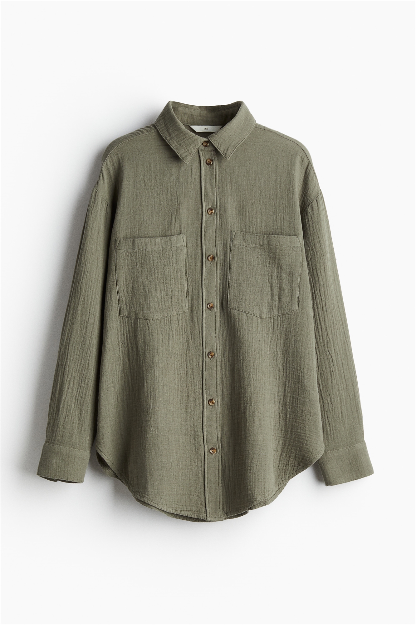 Рубашка из мягкого хлопкового полотна с воротником, пуговицами спереди и ярмом со складками сзади. Свободный крой с опущенными плечами, длинными рукавами с манжетами на пуговицах и открытыми нагрудными карманами. Аккуратный закругленный подол.
