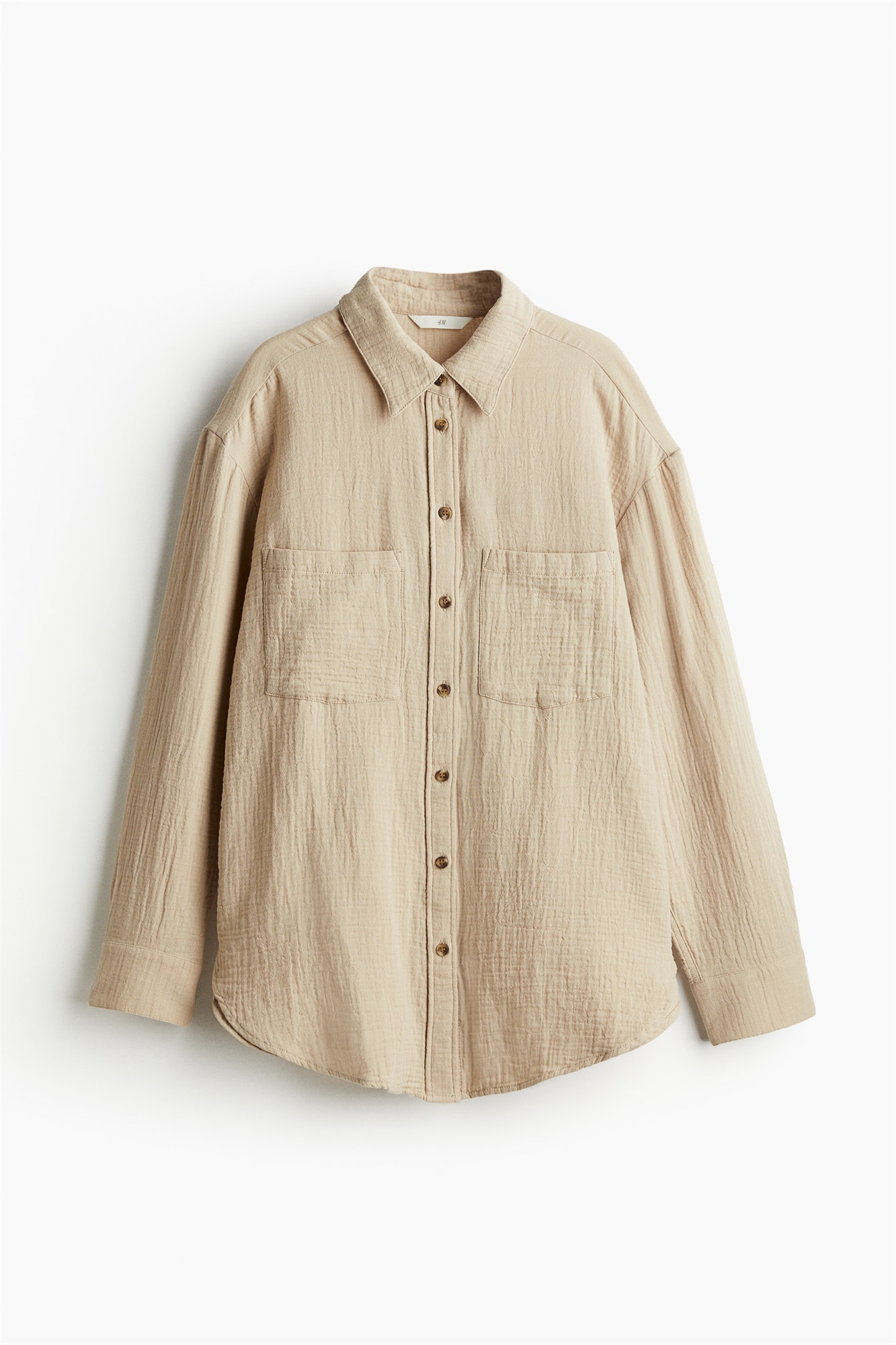 Рубашка из мягкого хлопкового полотна с воротником, пуговицами спереди и ярмом со складками сзади. Свободный крой с опущенными плечами, длинными рукавами с манжетами на пуговицах и открытыми нагрудными карманами. Аккуратный закругленный подол.