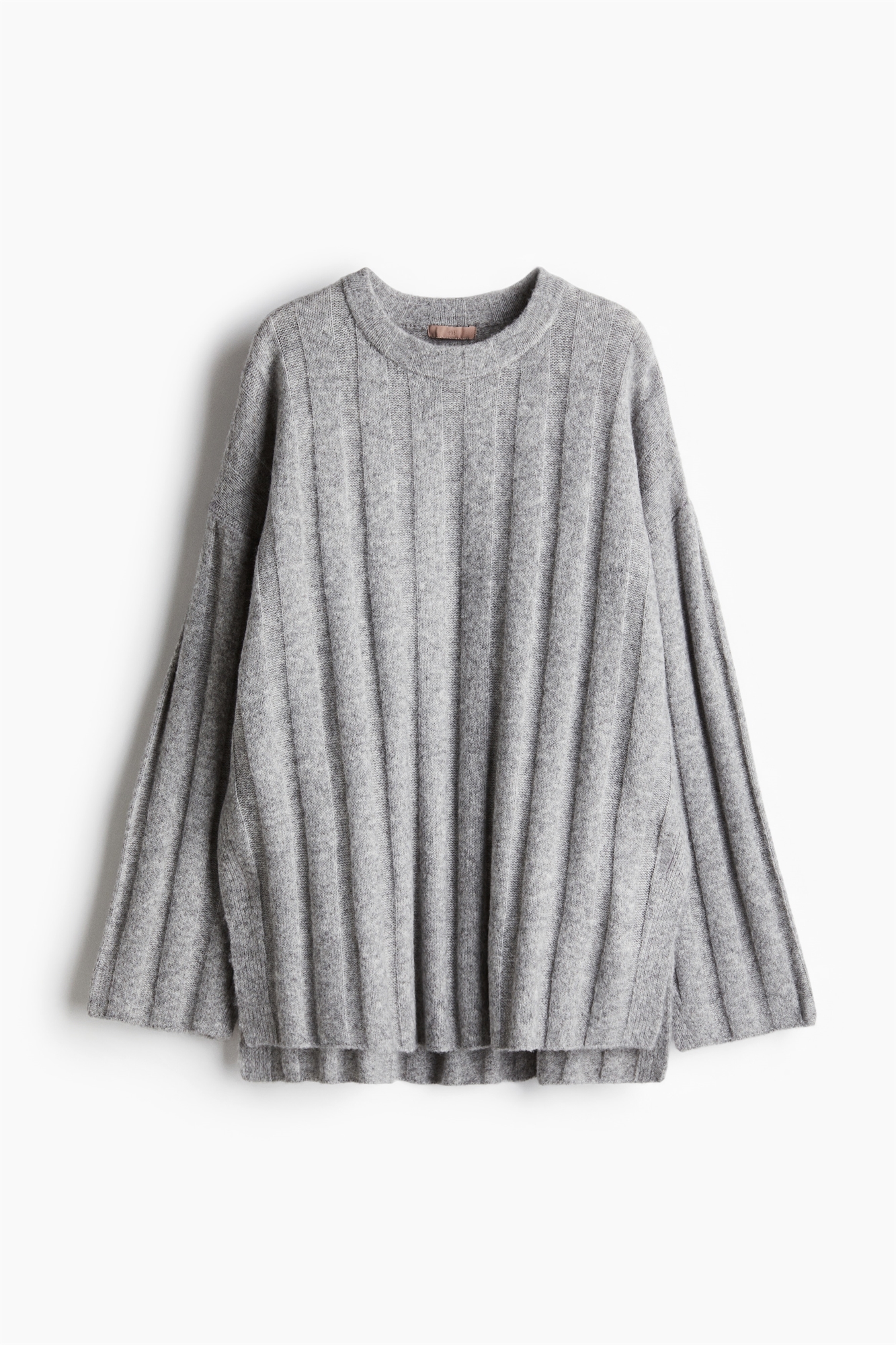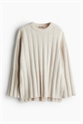 Джемпер оверсайз из мягкого трикотажа в рубчик из смеси шерсти. Круглый вырез, низко опущенные плечи и длинные рукава с разрезом на манжетах. Прямой подол с разрезом с каждой стороны. Слегка удлиненный сзади.