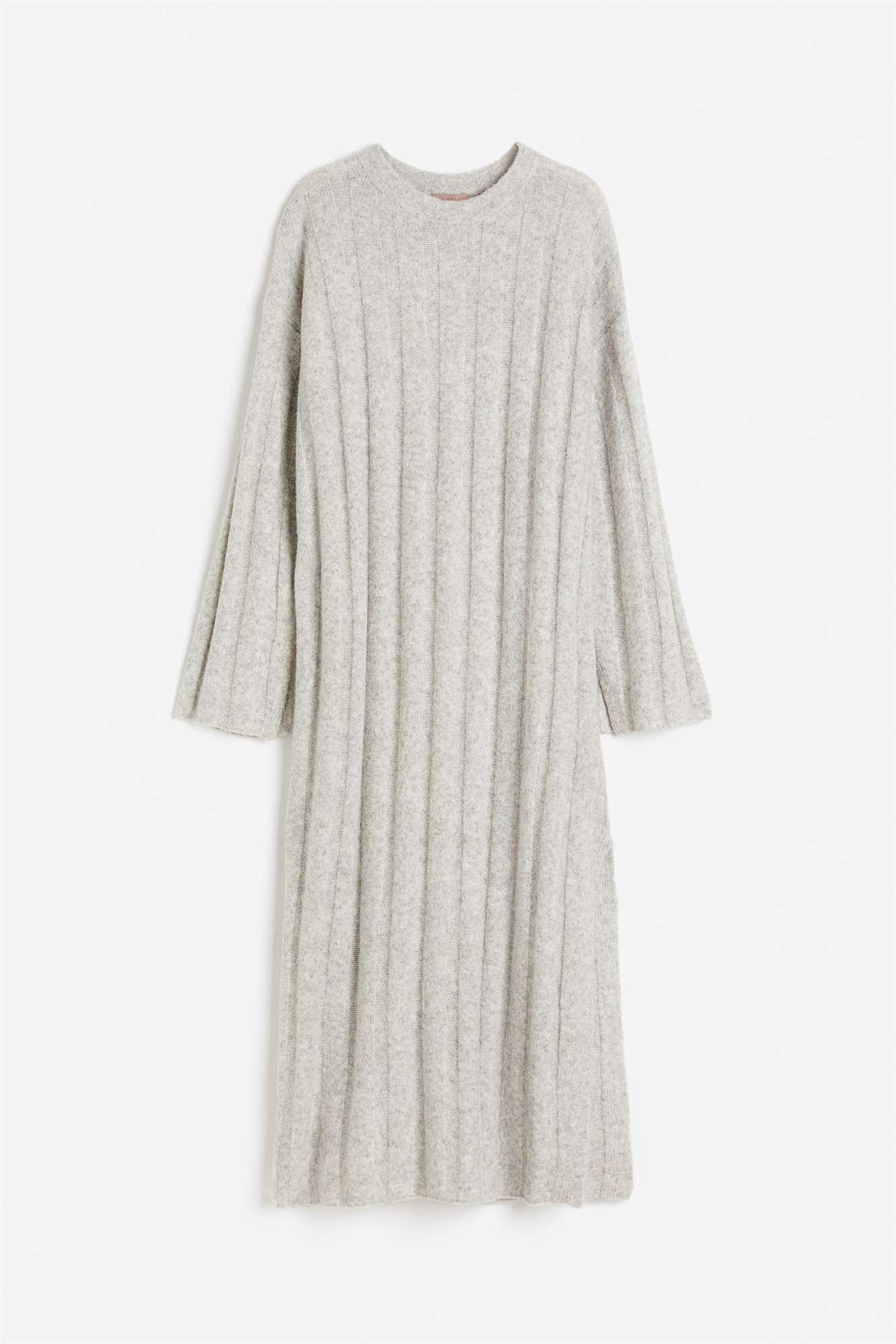 Платье длиной до щиколоток в стиле оверсайз из мягкого трикотажа в рубчик, выполненного из шерстяной смеси. Круглый вырез, спущенные плечи и длинные рукава с разрезом на манжетах. Прямой подол с разрезом с одной стороны.