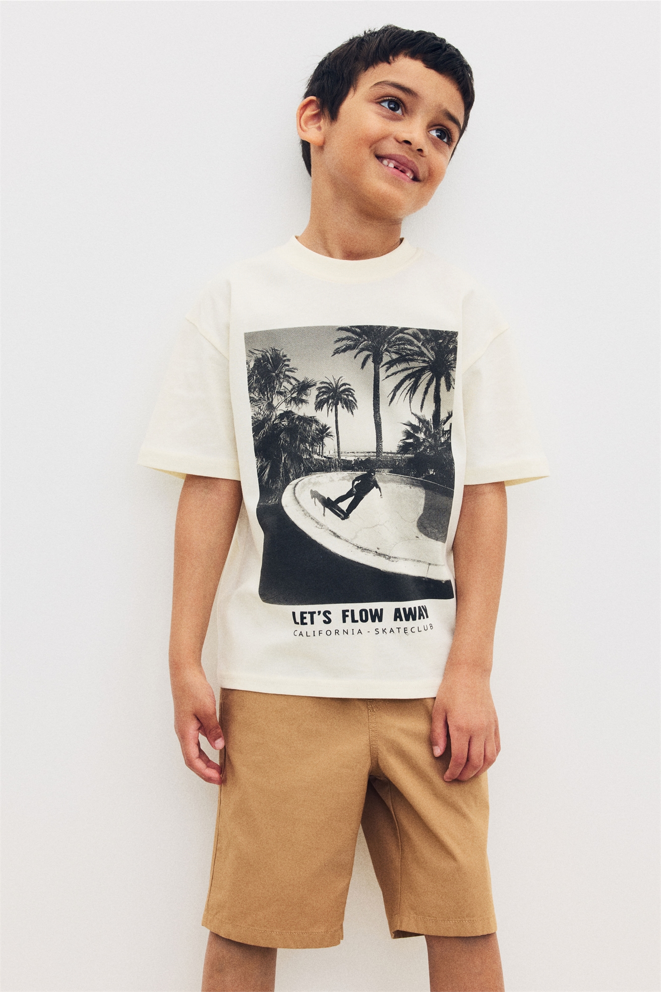 Шорты из мягкого хлопкового полотна с эластичным поясом на завязках, фальшивой ширинкой и диагональными боковыми карманами.