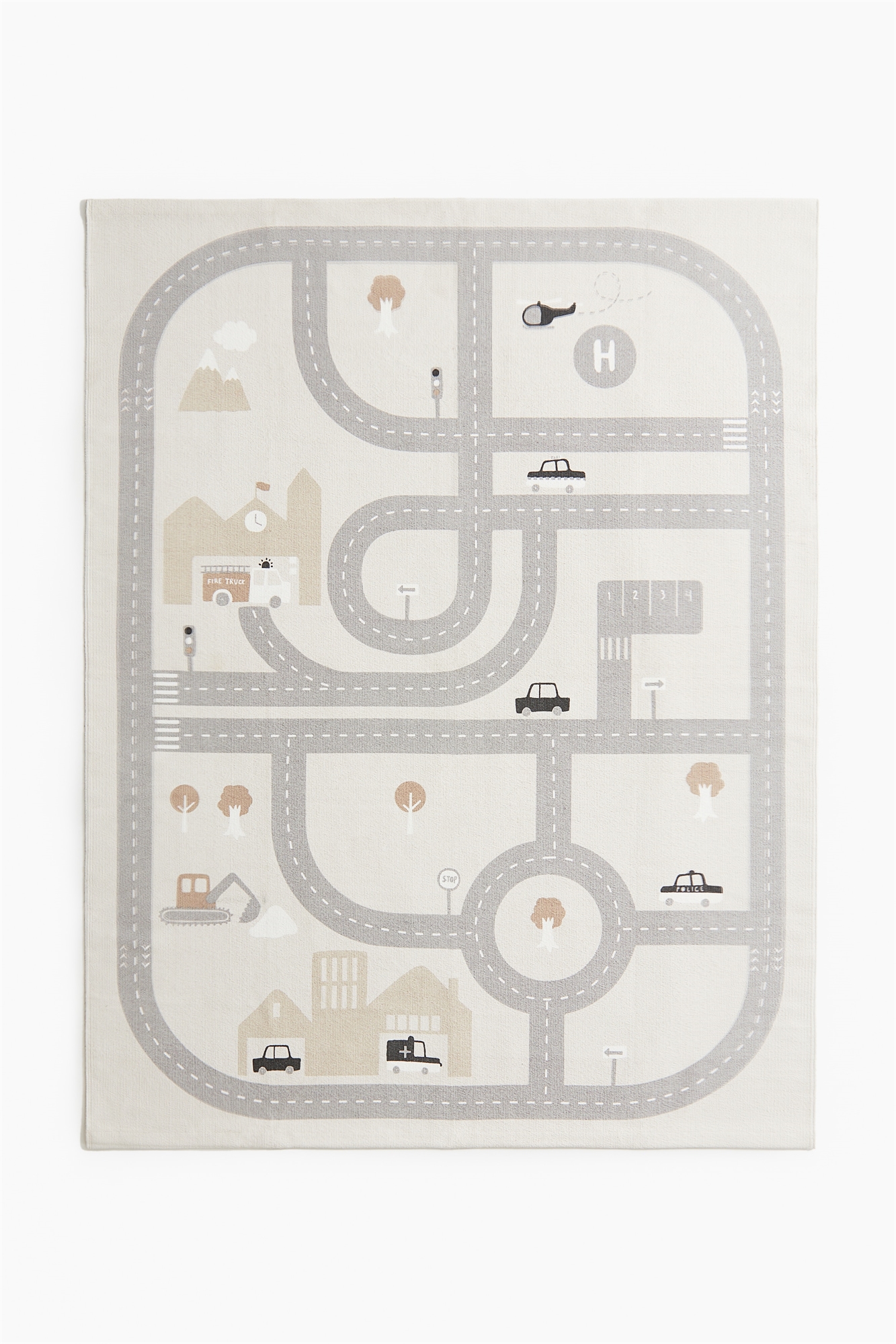 Коврик из прочного хлопкового холста с ворсистыми деталями и напечатанными машинами и дорогами на верхней части. Нескользящая нижняя сторона.