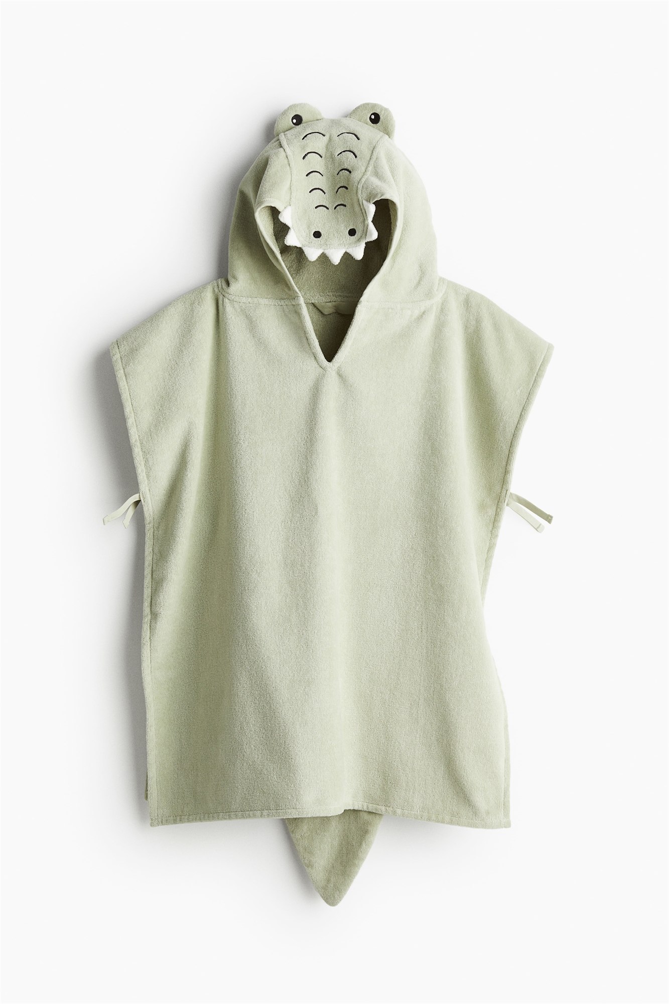Накидка для полотенца из мягкой хлопковой махры с велюром на внешней стороне. Капюшон с аппликацией и открытые бока с узкими завязками.