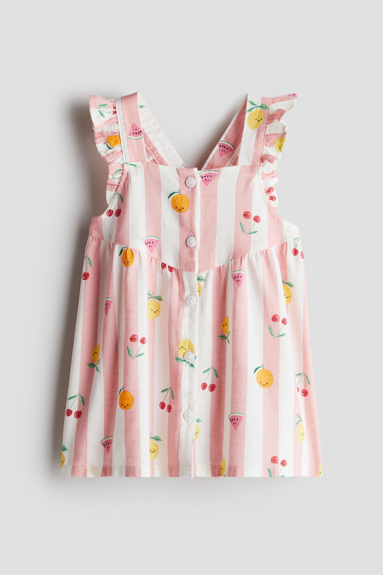 Платье длиной до колена без рукавов из воздушного хлопкового полотна с воланами на бретелях и квадратным вырезом с эластичной вставкой сзади. Пуговицы с деревянной отделкой спереди и сборчатый шов на талии. Без подкладки.