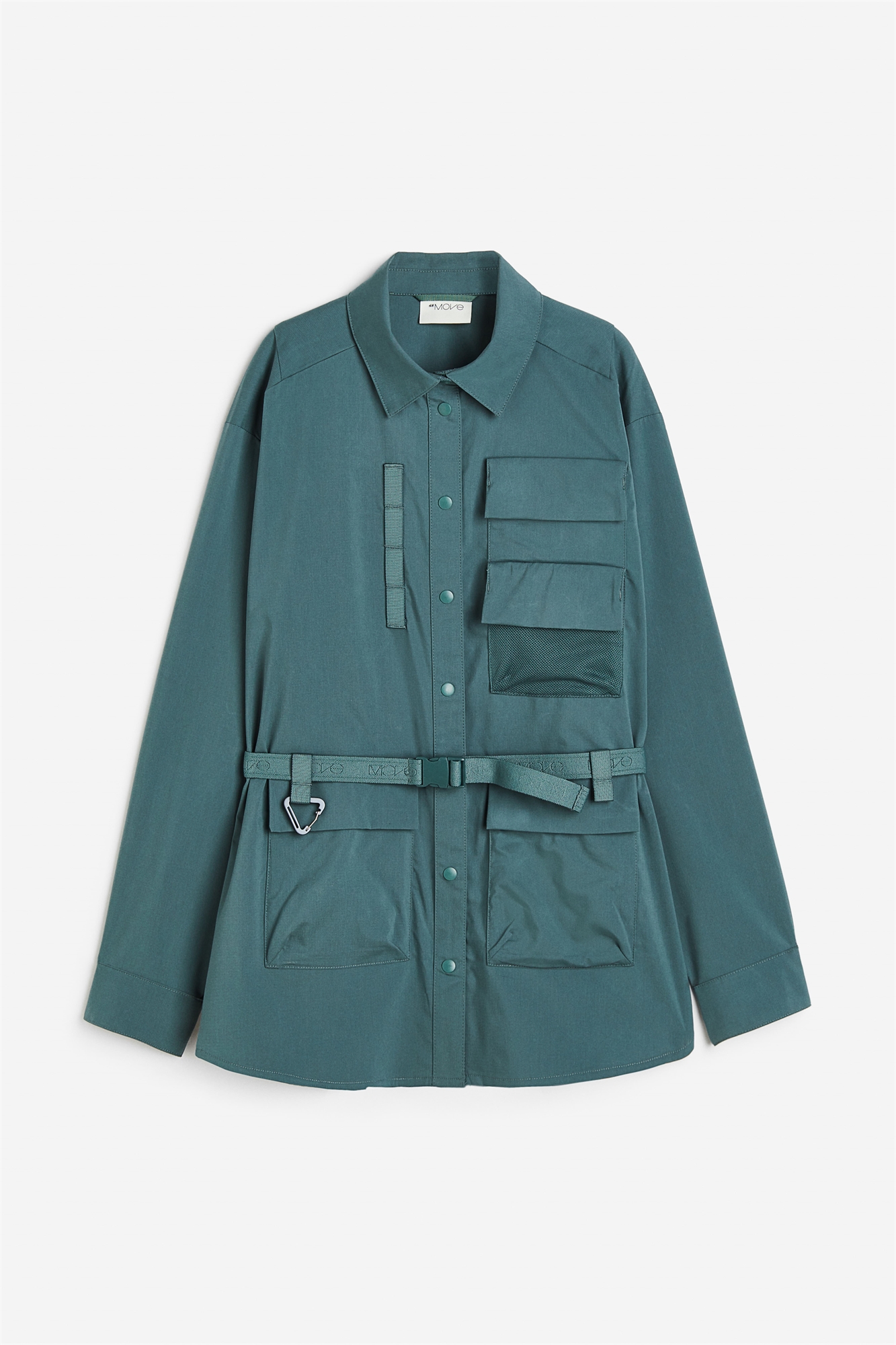 Слегка удлиненная блузка из эластичного, водоотталкивающего функционального материала, который не даст вам промокнуть во время небольшого дождя. Покрой оверсайз. С воротником, застежками-шпильками спереди и регулируемым поясом с пластиковой пряжкой и крючком-защелкой. Длинные рукава с застежкой на пуговицах и шпильками на манжетах. Петли с цепочкой "маргаритка" и накладные карманы на груди, а также накладные карманы с застежкой-липучкой спереди. V-образный задний воротник и слегка закругленный подол.