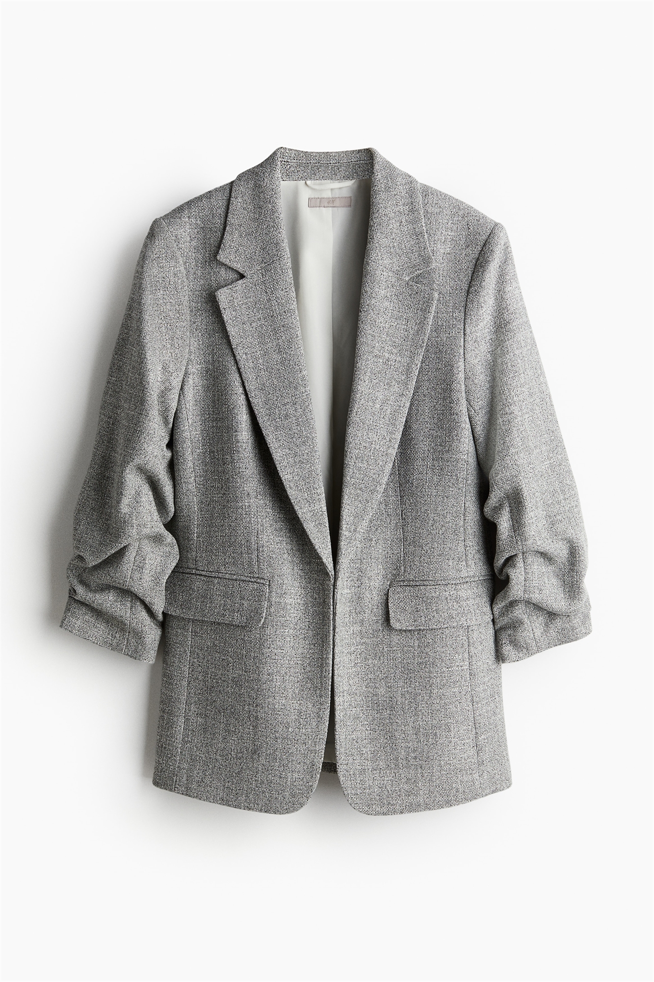 Открытый приталенный блейзер из вискозной смеси. Воротник с лацканом, рукава длиной 3/4, подплечники и накладные карманы. На подкладке.