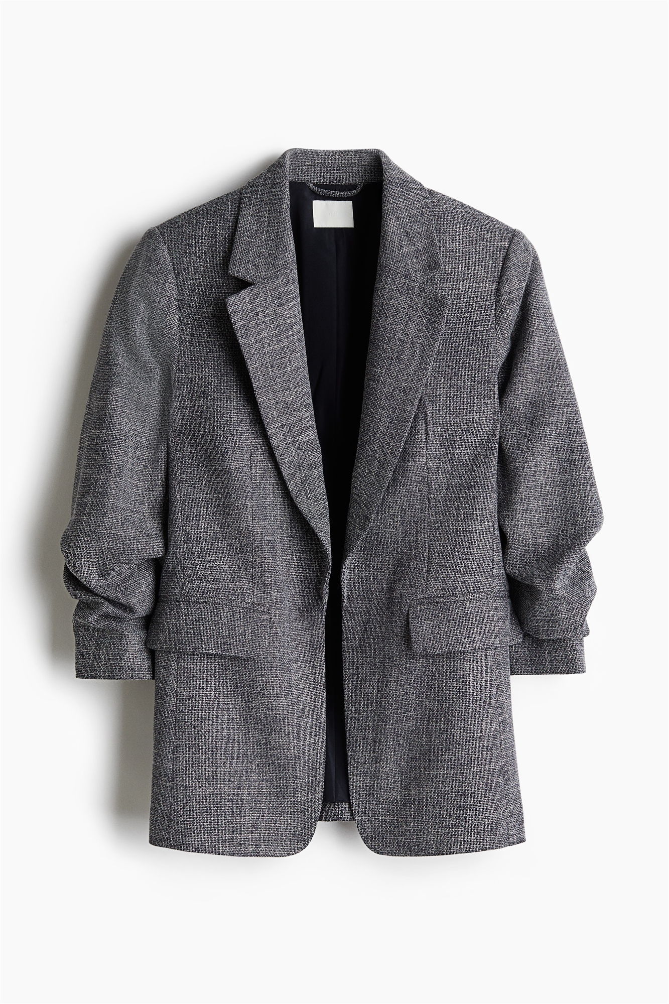 Открытый приталенный блейзер из вискозной смеси. Воротник с лацканом, рукава длиной 3/4, подплечники и накладные карманы. На подкладке.