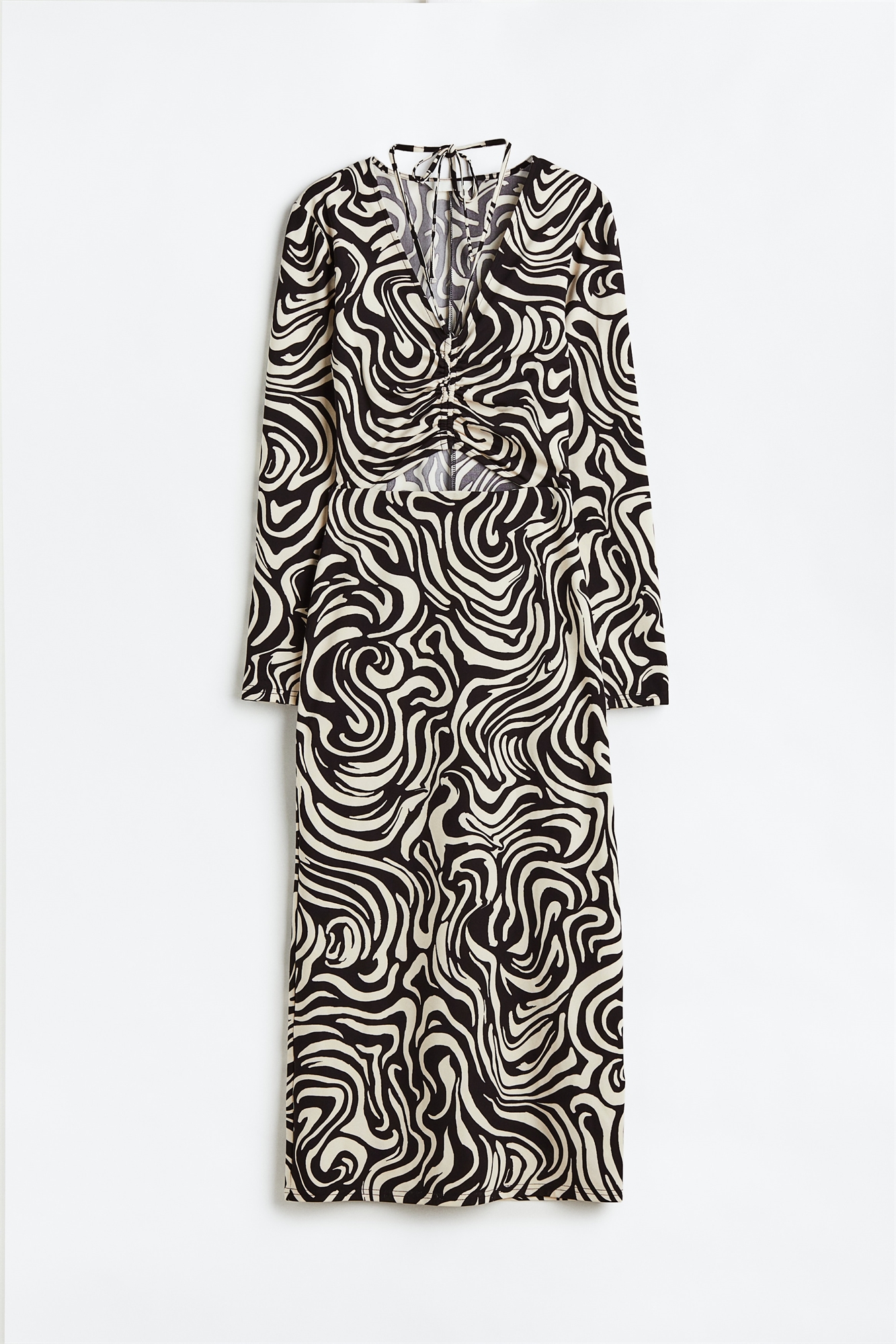 Приталенное платье длиной до колен из тканого материала. V-образный вырез, разрез и завязки спереди для создания эффекта драпировки, длинные рукава.