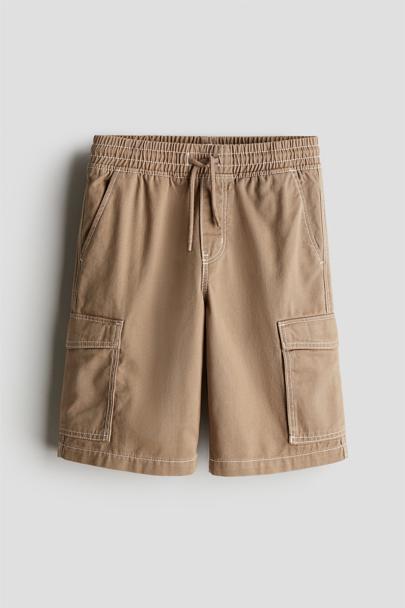 Шорты-карго из хлопковой саржи. Свободный крой, эластичный пояс с завязками и фальшивая ширинка. Диагональные передние карманы, накладные карманы на ногах и фальшивые задние карманы.