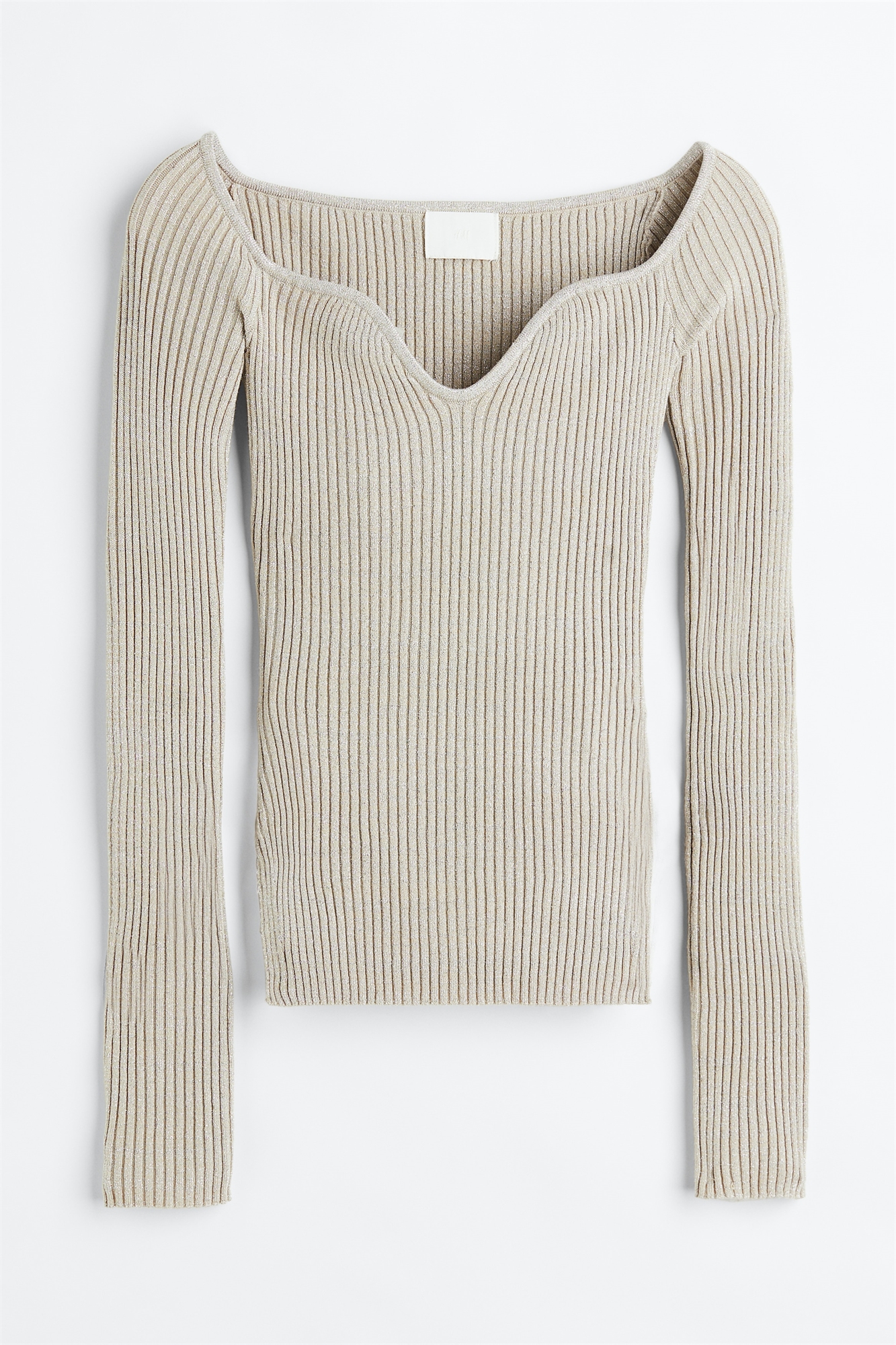 Короткий приталенный топ из трикотажа в рубчик с блестящими нитями. Вырез в форме сердца, длинные рукава и прямой подол с разрезом по бокам.