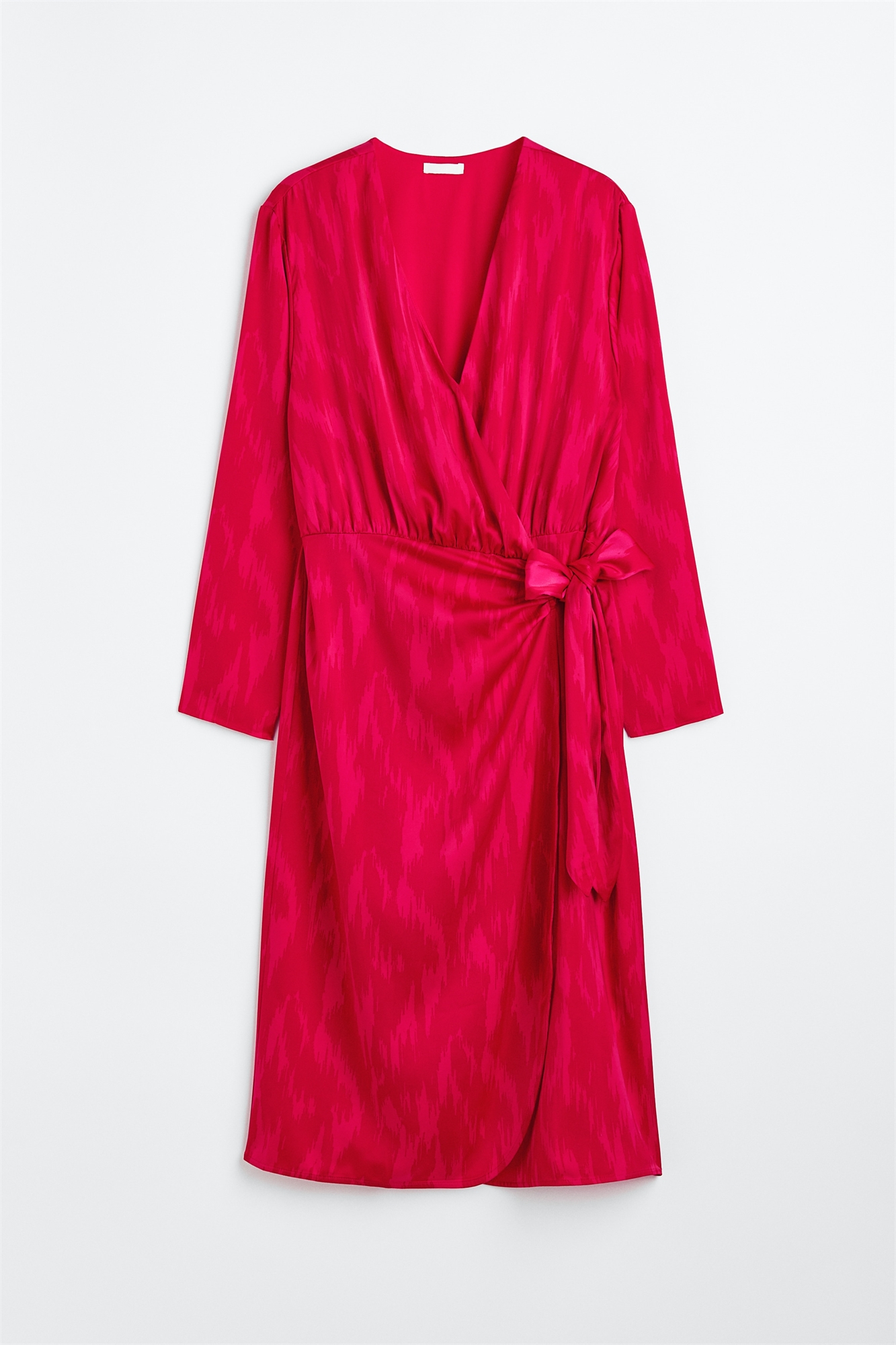 Платье длиной до колена из мягкого, струящегося атласа. Обтягивающий фасон с V-образным вырезом, широкими завязками с одной стороны и узкими потайными завязками с другой. Слегка спущенные плечи и длинные рукава. Собранный шов на талии с узкой эластичной лентой сзади создает эффект драпировки. Частично на подкладке.