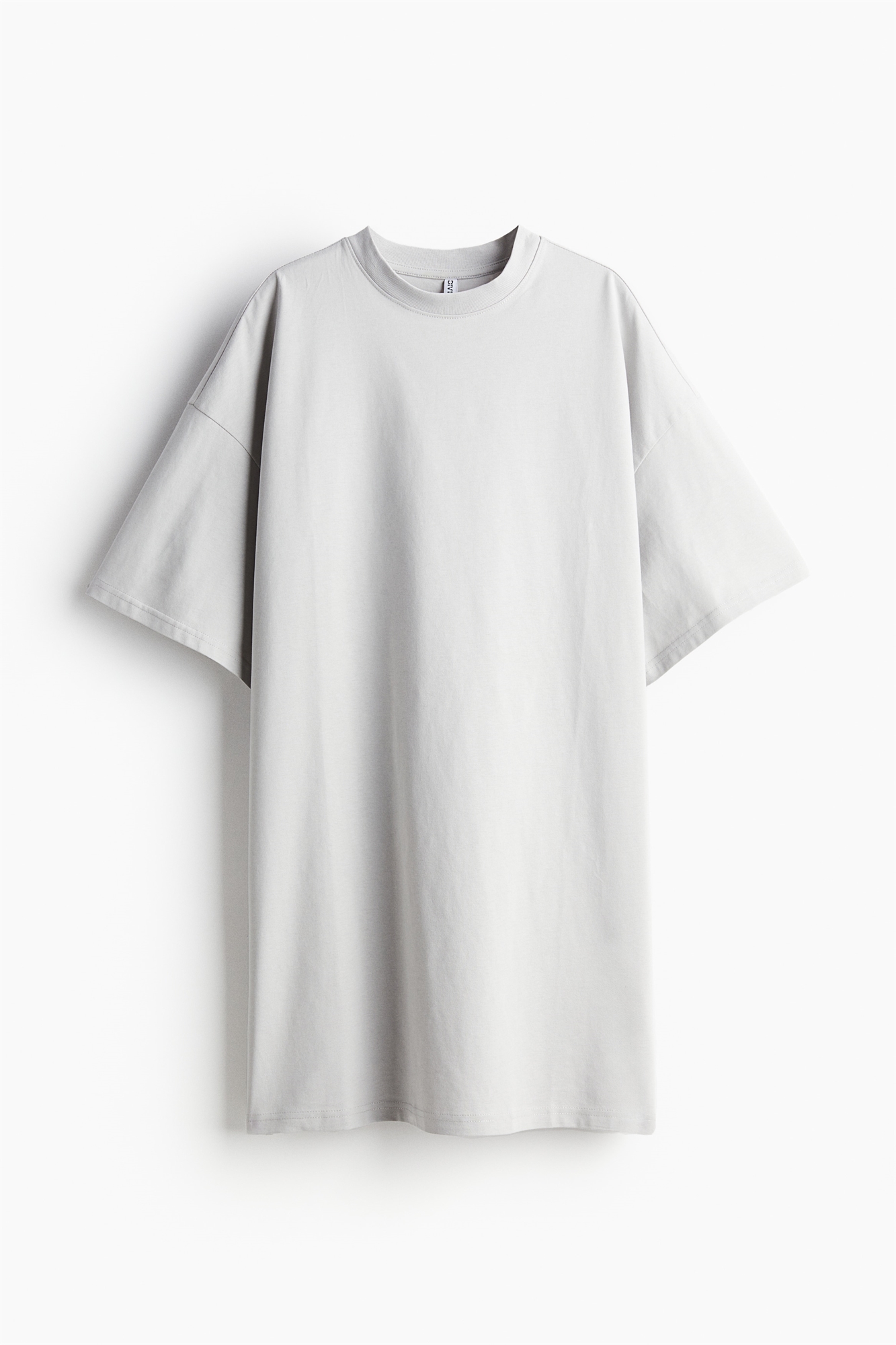 Короткое платье-футболка оверсайз из мягкого хлопкового джерси с ребристой отделкой горловины и спущенными плечами.