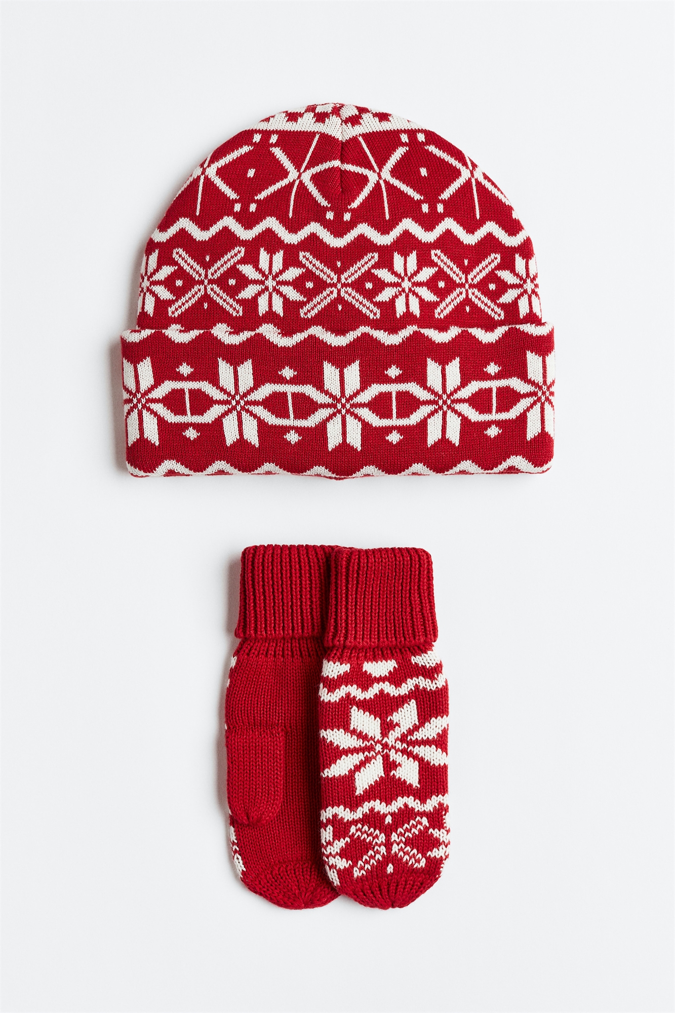 Комплект из шапки и варежек жаккардовой вязки. Шапка с отворотом на подоле. Варежки с ребристыми отворачивающимися манжетами.