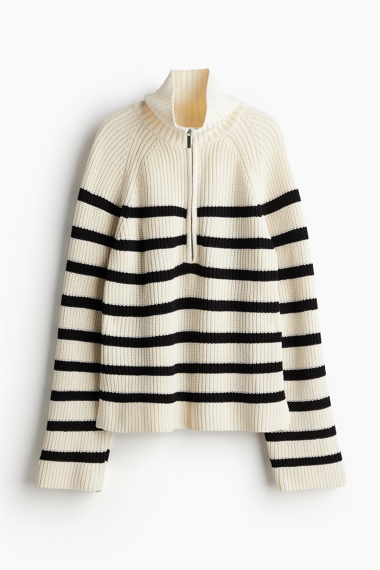 Джемпер из мягкого трикотажа в рубчик из смеси хлопка. Воротник-стойка, застежка-молния сверху, длинные рукава реглан и прямой подол с разрезом с каждой стороны.