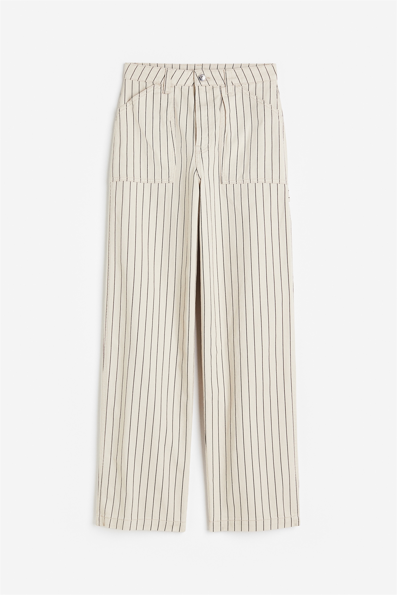 Свободные брюки-карго из хлопковой саржи. Высокая талия, ширинка на молнии и пуговице, диагональные боковые и задние карманы. Широкие прямые штанины с петлей для молотка и накладным карманом на одной штанине.
