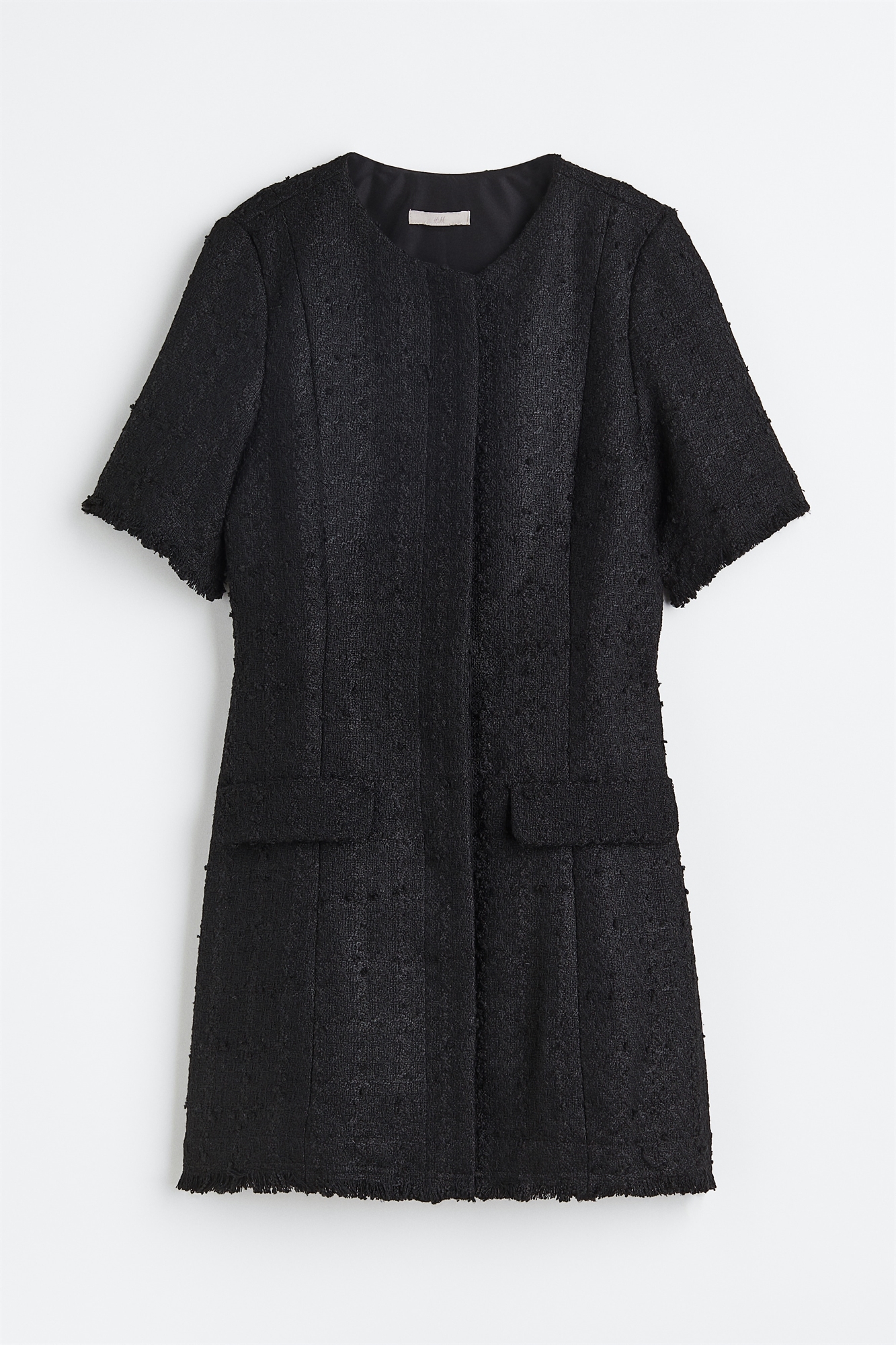 Короткое приталенное платье из фактурного переплетения букли. Круглый вырез, потайные пуговицы спереди, короткие рукава и фальшивые накладные карманы спереди. Необработанные края манжет и подола.