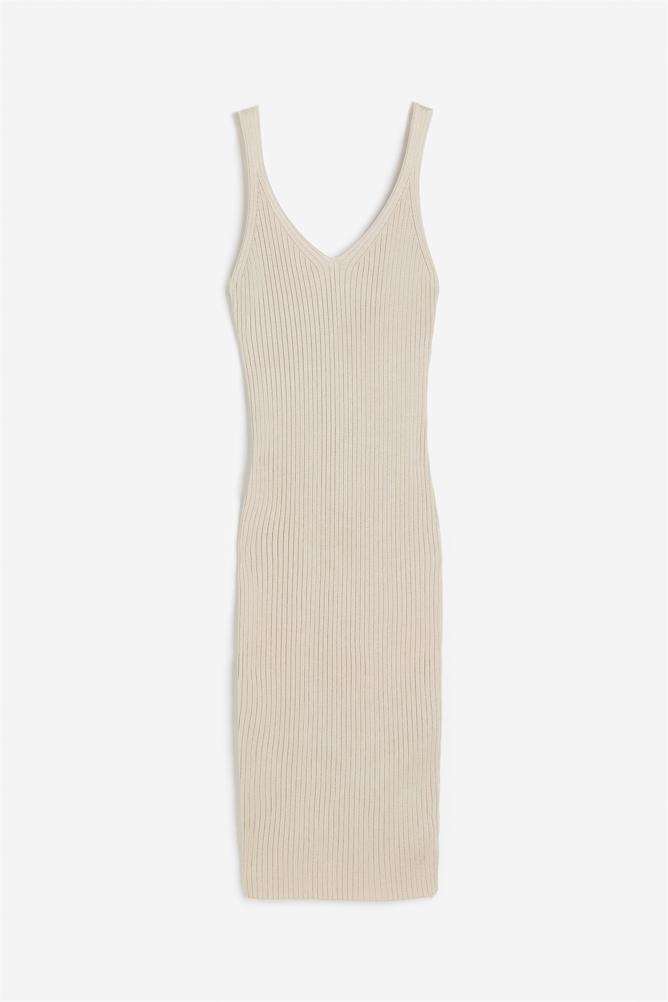 Приталенное платье без рукавов длиной до щиколоток из трикотажа в рубчик с легким блеском. Глубокий V-образный вырез спереди и сзади и прямой подол.
