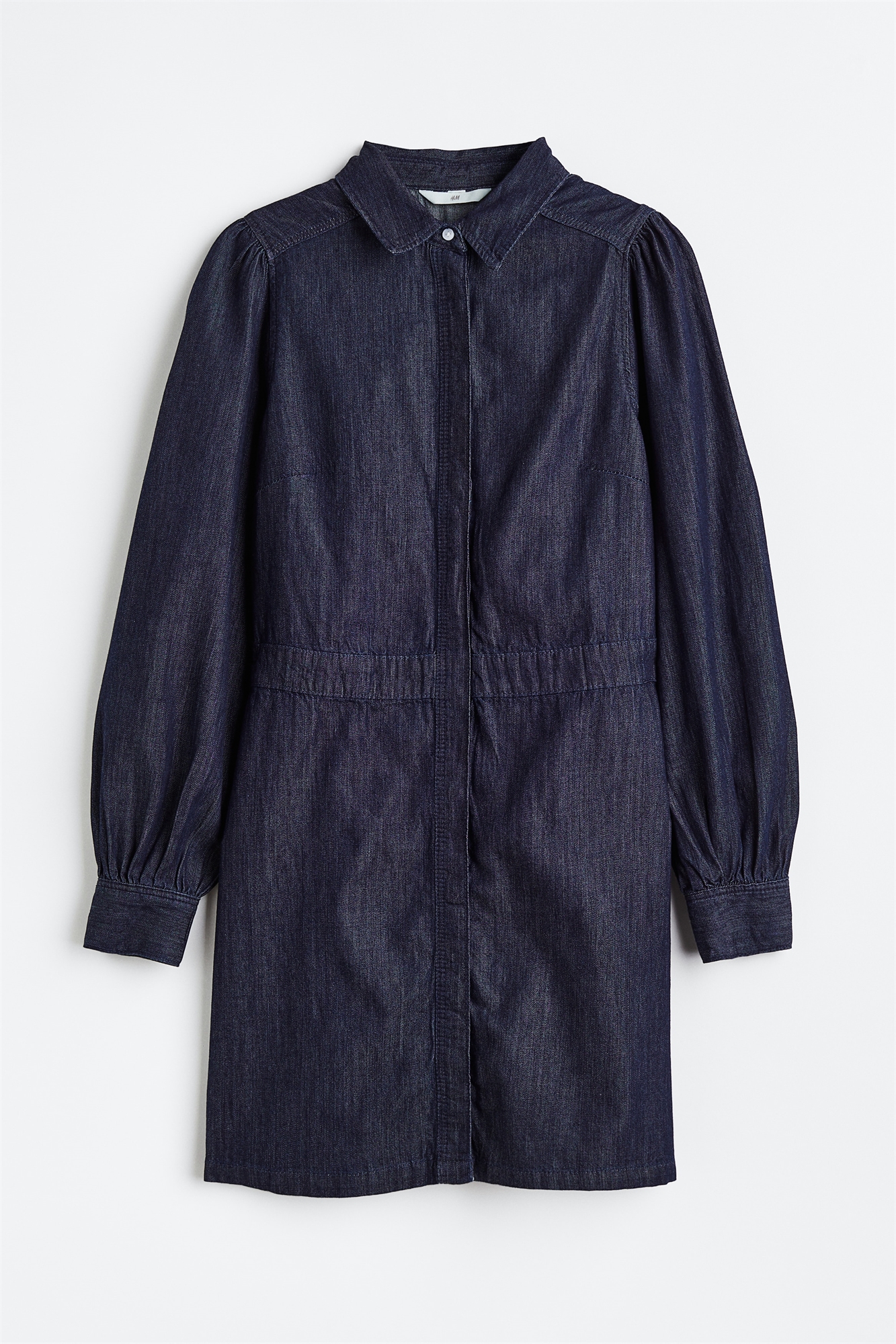 Короткое приталенное платье из прочного хлопкового денима с воротником, потайными пуговицами спереди и передом. Длинные пышные рукава с манжетами на пуговицах, нагрудные вытачки и потайная резинка сзади на талии. Без подкладки.