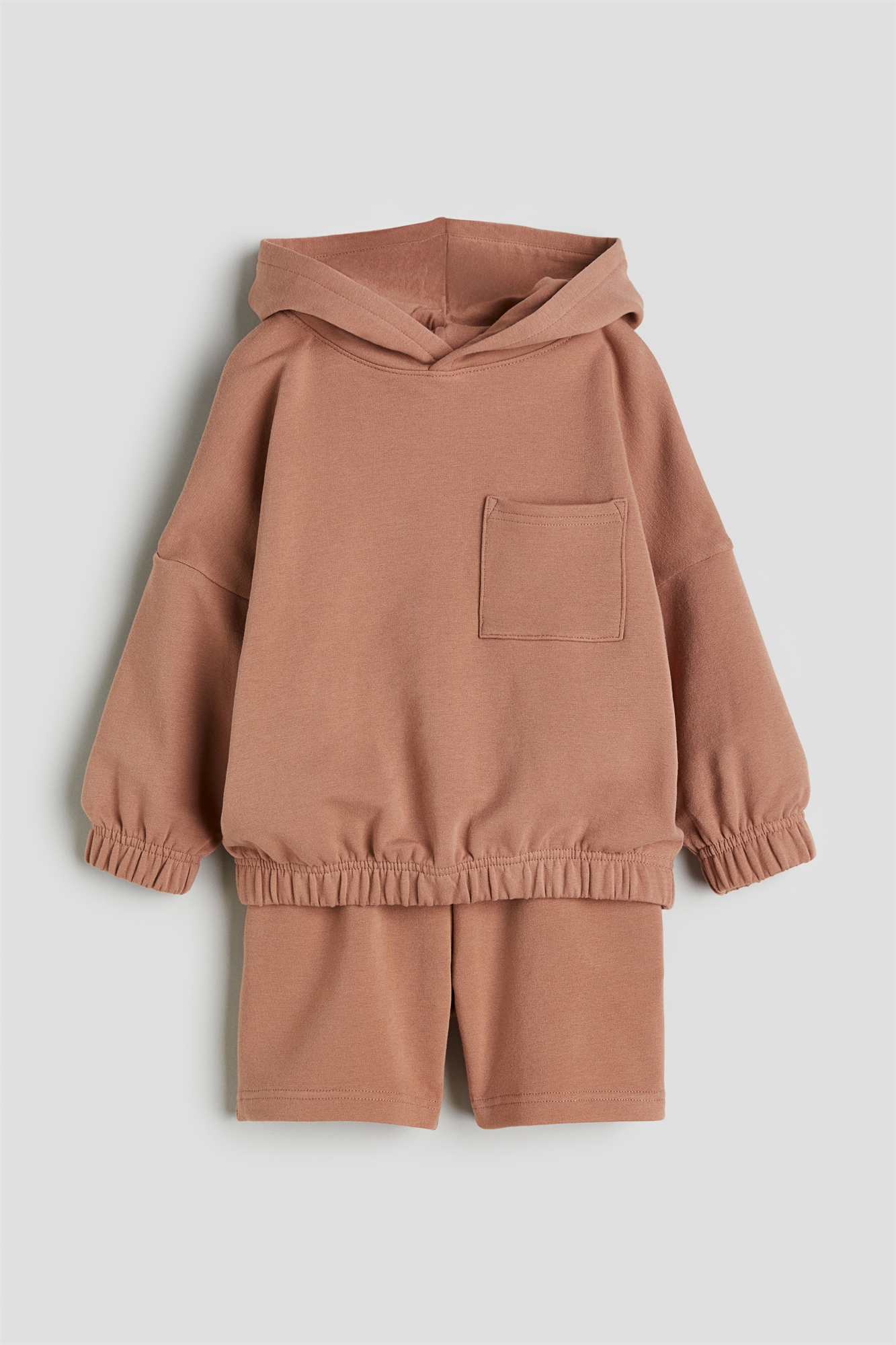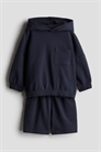 Детский эксклюзив. Уютный комплект из толстовки и пары шорт из толстовочной ткани с мягким начесом внутри. Толстовка с капюшоном на трикотажной подкладке, спущенными плечами, длинными рукавами, открытым нагрудным карманом и мягкими эластичными вставками на манжетах и подоле. Шорты с регулируемой эластичной талией, незаметными боковыми карманами и открытым задним карманом.