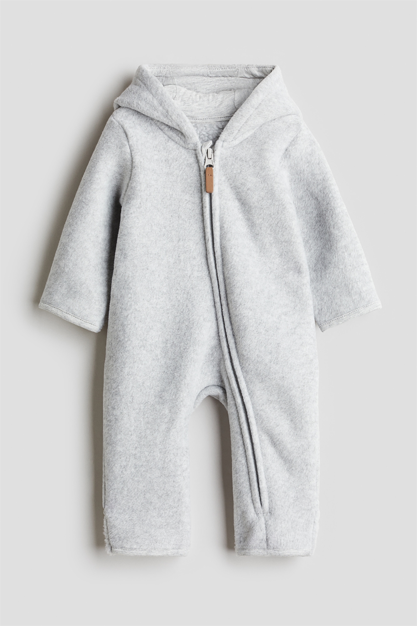 Комбинезон из мягкого флиса, который также можно носить как согревающий полукомбинезон. У комбинезона есть капюшон на трикотажной подкладке с пришитыми ушками и передняя застежка-молния с защитой подбородка, которая продолжается по одной штанине. Удлиненные манжеты на рукавах и ногах с ребристой отделкой, чтобы ребенок мог расти вместе с ними.