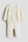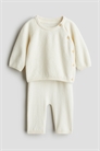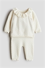 Комплект из джемпера из фактурного трикотажа и пары брюк из мягкого хлопкового трикотажа. Джемпер с круглым вырезом, длинными рукавами реглан, пуговицами на одном плече и по бокам, а также тесемками по вырезу, манжетам и подолу. Брюки с эластичной тесьмой на талии и ребристыми каймами.