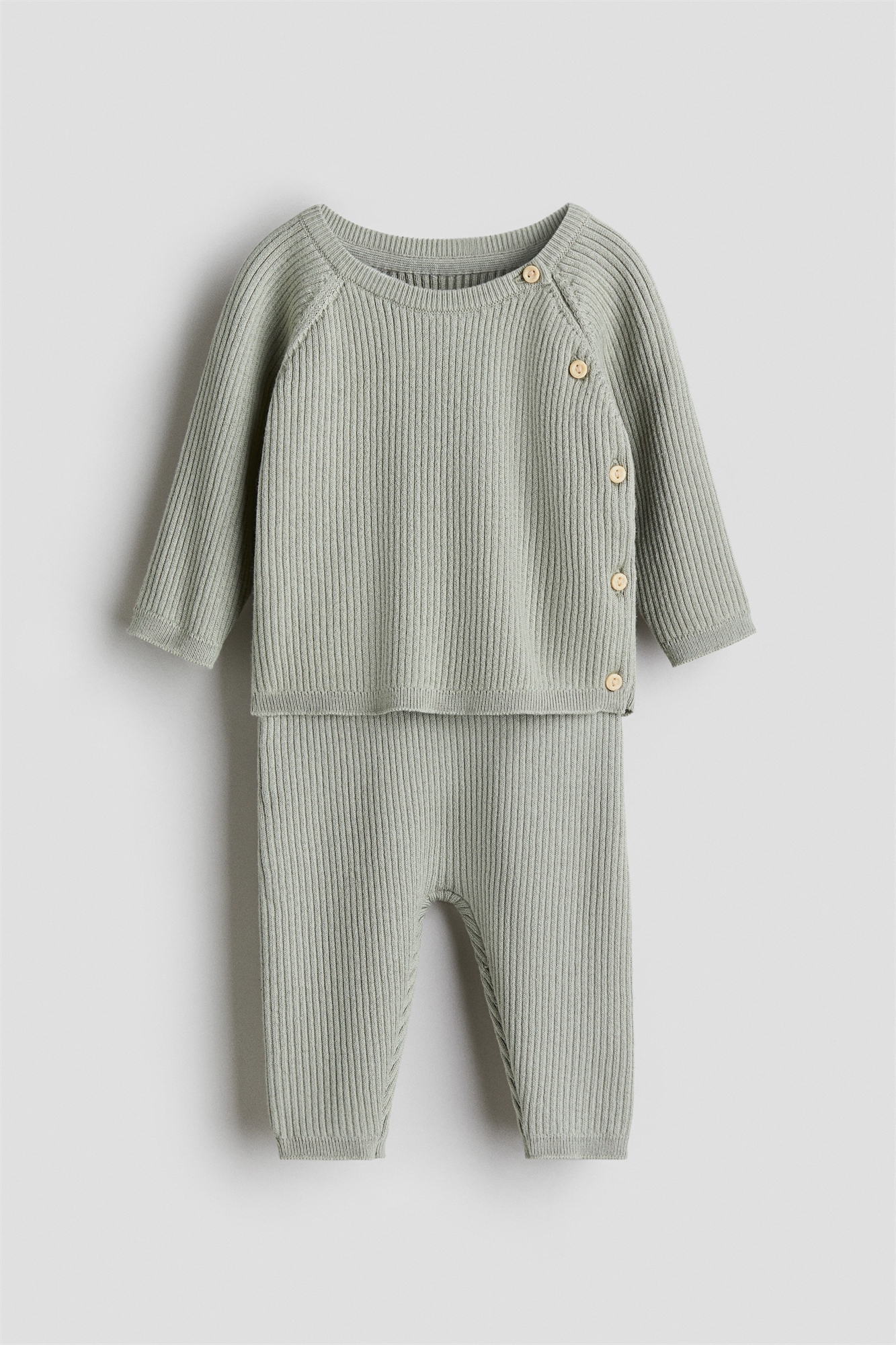 Комплект из джемпера из фактурного трикотажа и пары брюк из мягкого хлопкового трикотажа. Джемпер с круглым вырезом, длинными рукавами реглан, пуговицами на одном плече и по бокам, а также тесемками по вырезу, манжетам и подолу. Брюки с эластичной тесьмой на талии и ребристыми каймами.