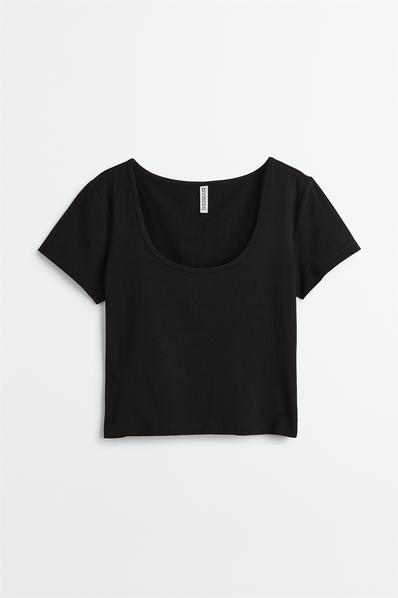 Короткая, облегающая фигуру футболка из мягкого хлопкового джерси с широким вырезом, короткими рукавами и прямым подолом.