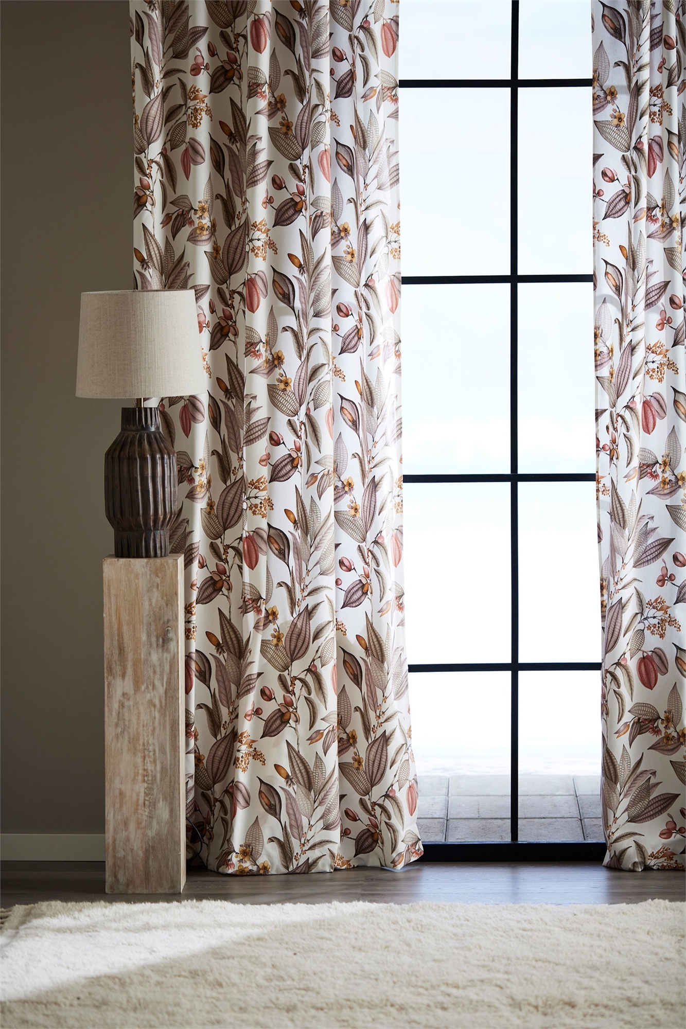 Две многофункциональные шторы из хлопковой ткани с принтом. Модель с многофункциональной лентой в верхней части, подшитыми длинными краями и оверлочным швом по подолу. Многофункциональная лента позволяет подвешивать модель на шторные крючки, прищепки или штангу, в зависимости от желаемой драпировки. Для укорачивания до желаемой длины рекомендуется использовать ленту для подшивки. Усадка составляет не более 3 %. Ширина каждого шарфа 135 см, длина 315 см.