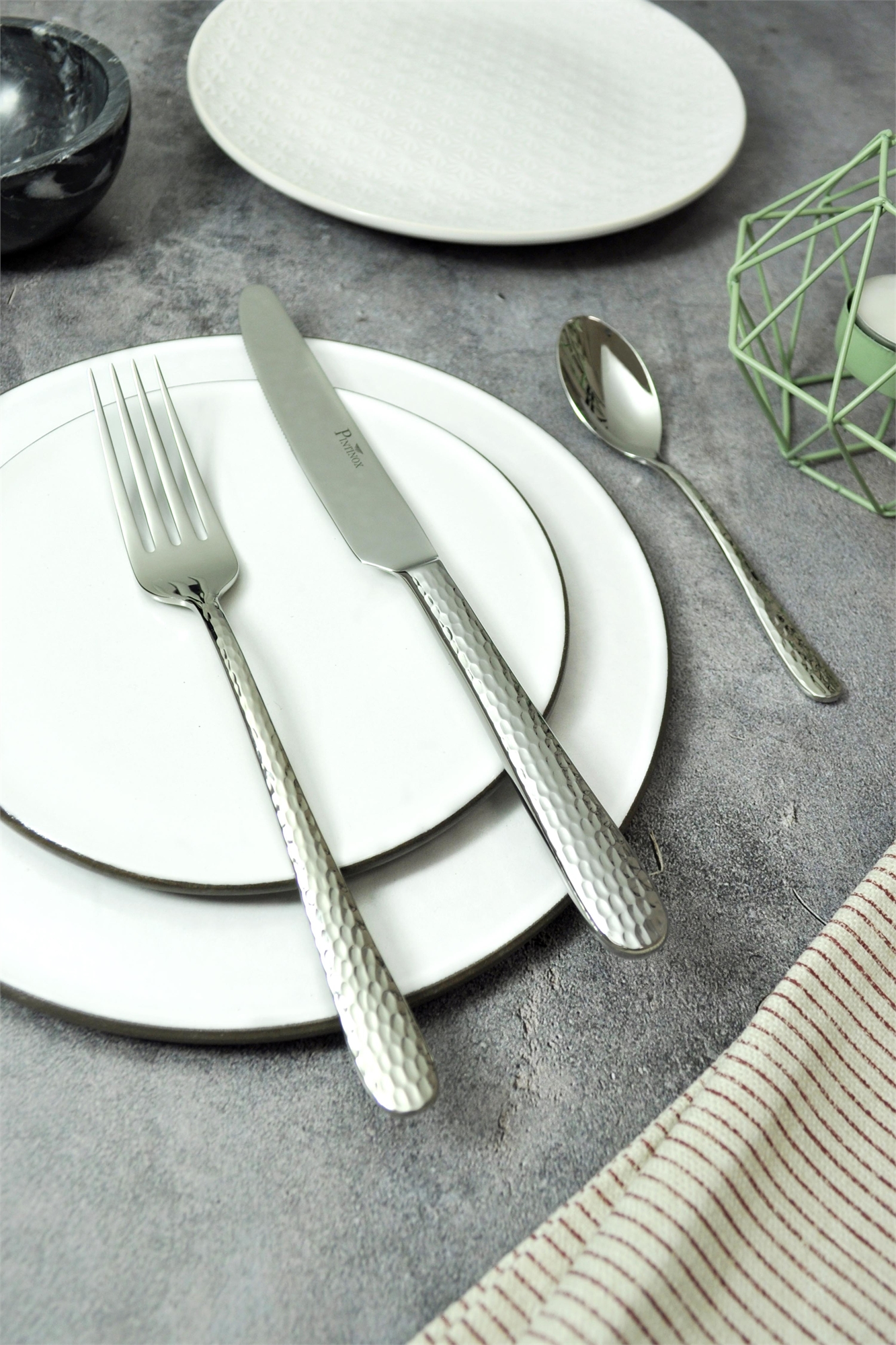 Кованая ручка Luna вдохновлена поверхностью Луны. Ее толщина составляет 3 мм, а в набор из 24 предметов входят 6 вилок 19,7 см - 6 ложек 19,7 см - 6 ножей 23 м - 6 ложек для чая/кофе 14 см. Он изготовлен из высококачественной нержавеющей стали 18/10. Изделие можно мыть в посудомоечной машине.