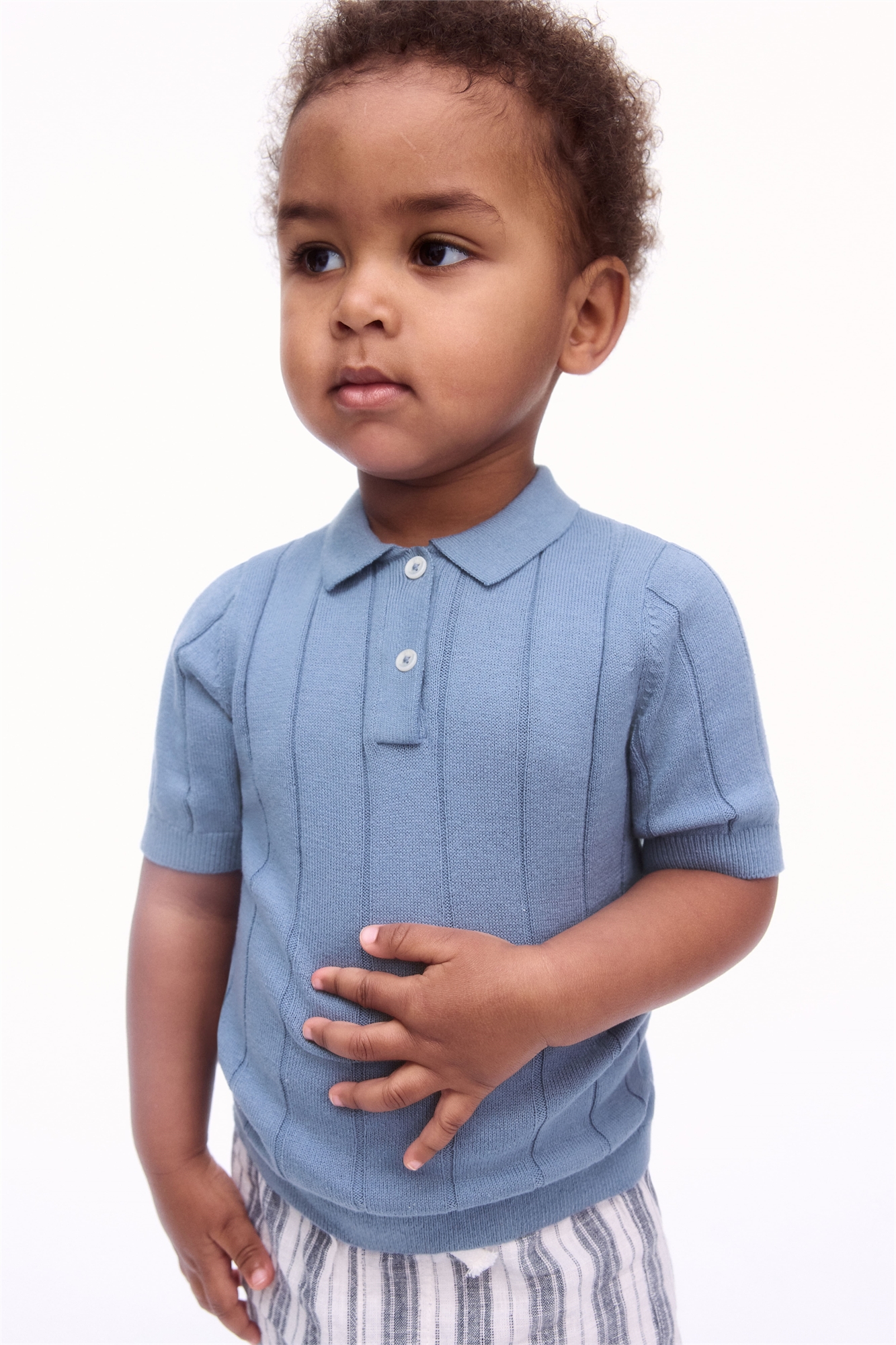 Трикотажная рубашка-поло из мягкого хлопка с воротником, ребристой тесьмой на пуговицах и короткими рукавами. Ребристые манжеты и подол.