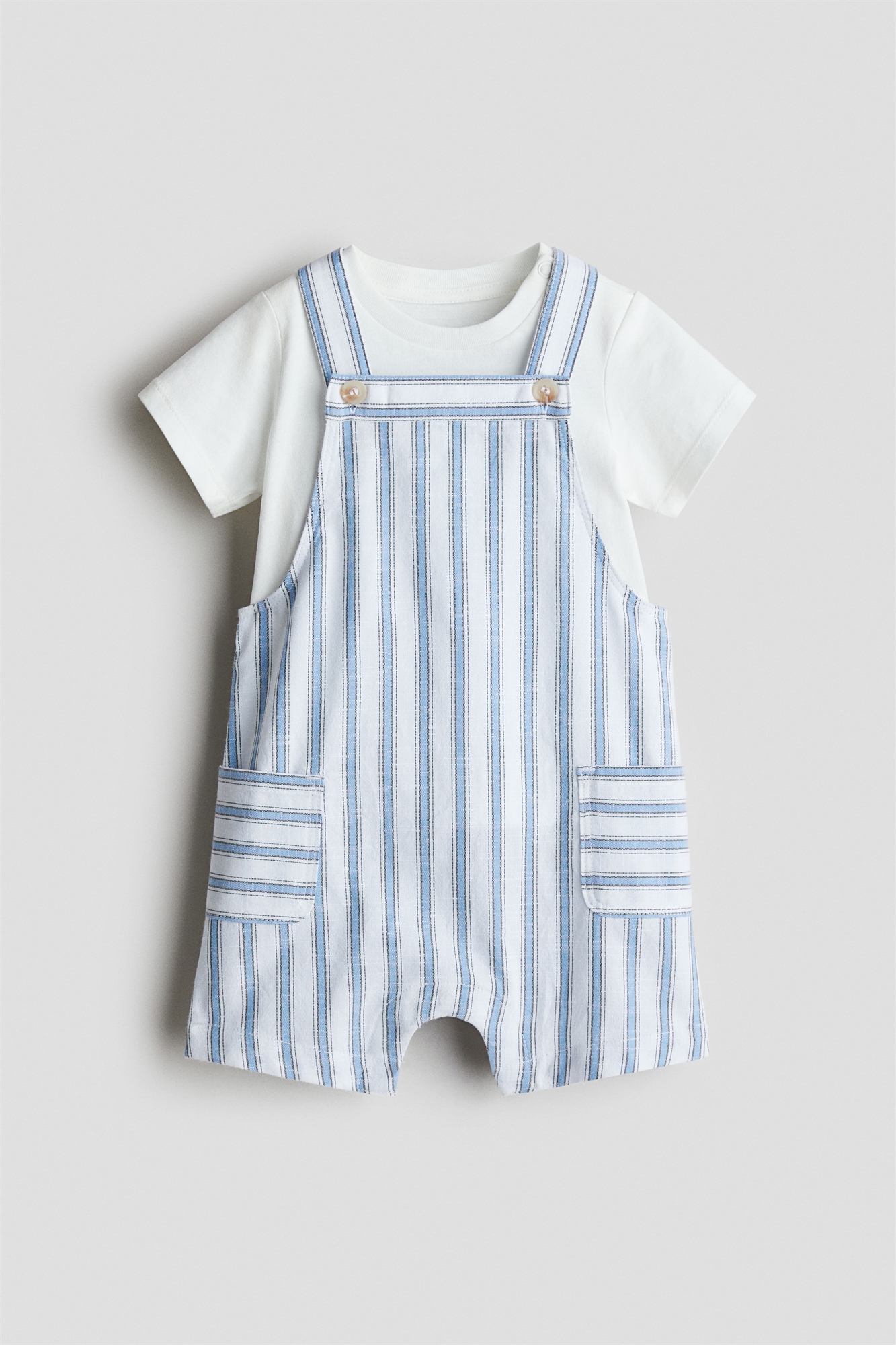 Комплект из футболки из мягкого хлопкового джерси и пары шорт из хлопкового плетения. Футболка с пришивной планкой на одном плече (кроме размеров 2-4Y). Шорты-джунгари с пуговицами спереди, лямками с кнопками спереди и накладными передними карманами.