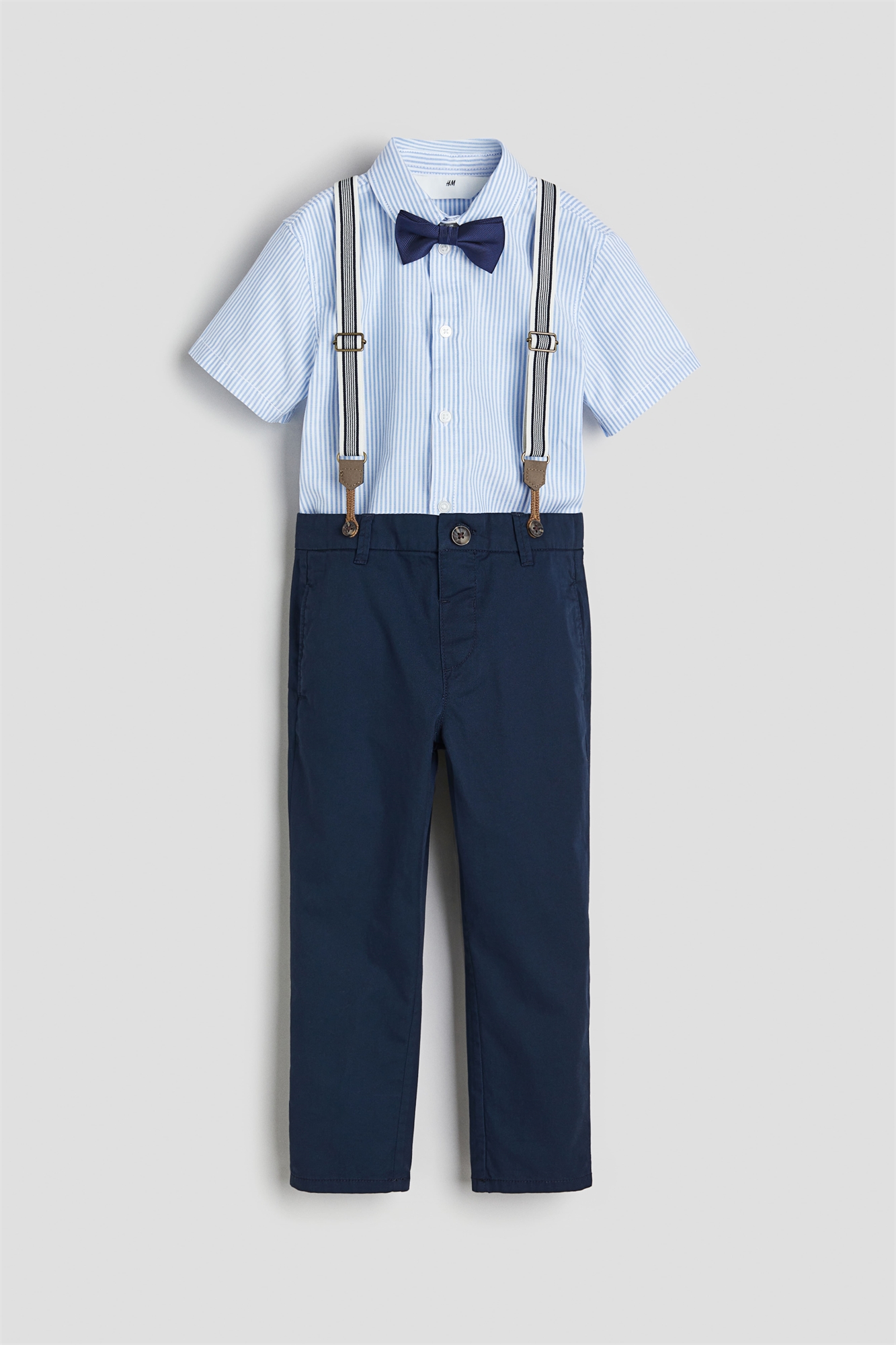 Комплект из рубашки с короткими рукавами и брюк из хлопчатобумажного полотна с лямками и галстуком-бабочкой. Классическая рубашка с воротником, застежкой на пуговицы спереди, передом и закругленным подолом. Брюки с регулируемым эластичным поясом, фальшивой ширинкой и пуговицей, неброскими боковыми карманами и фальшивым задним карманом. Галстук-бабочка с регулируемым эластичным ремешком и пластиковой застежкой сзади. Съемные регулируемые бретели.